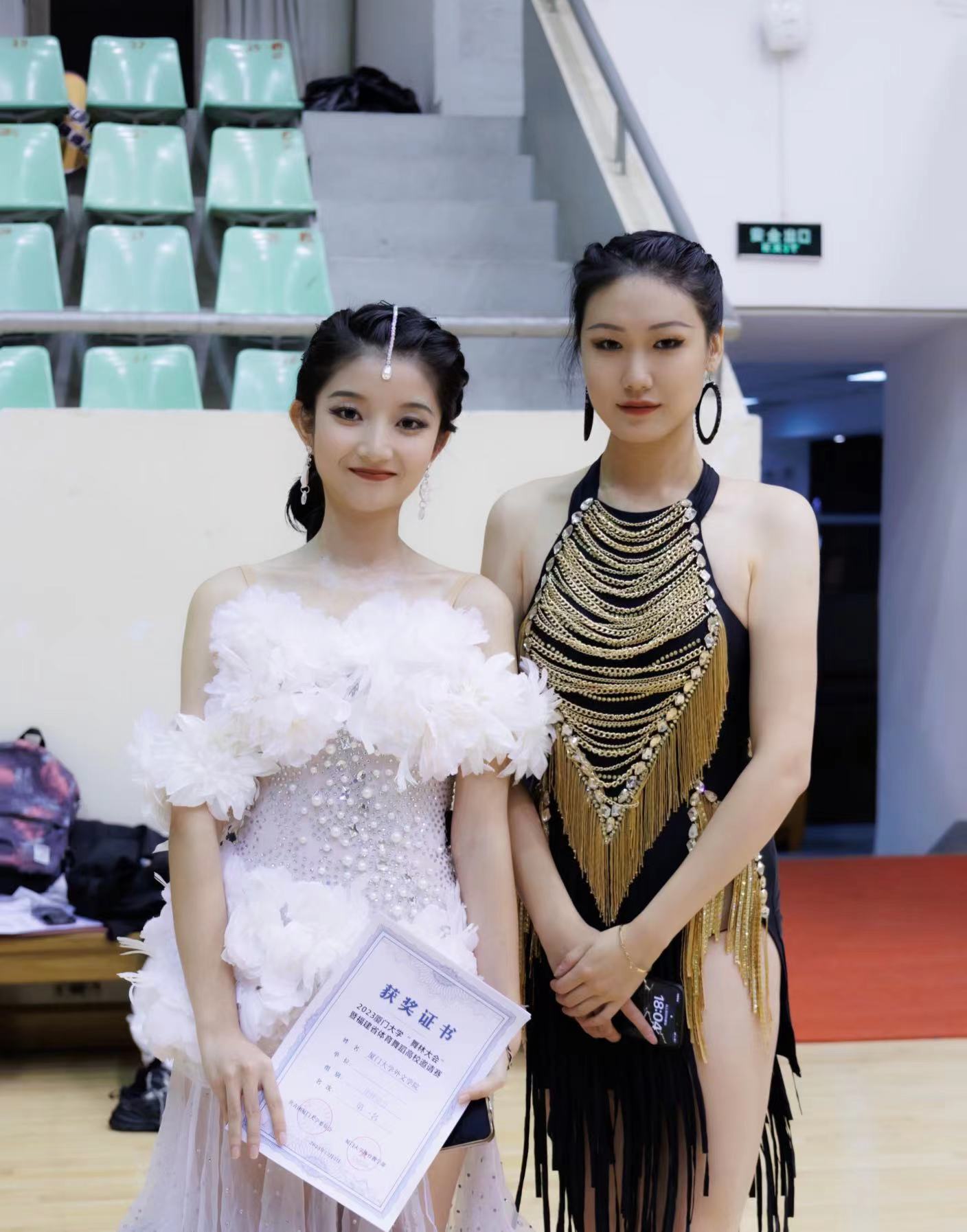双人赛中,2021级英语专业本科生马天怿携手2021级管理学院本科生李芊叶获得B组拉丁舞第一名、单项拉丁舞(J)第一名、单项拉丁舞(S)第一名;2021级法语专业本科生王李丹妮携手2020级哲学专业本科生张恒瑞获得C组拉丁舞第一名、单项拉丁舞(C)第二名、单项拉丁舞(R)第三名。