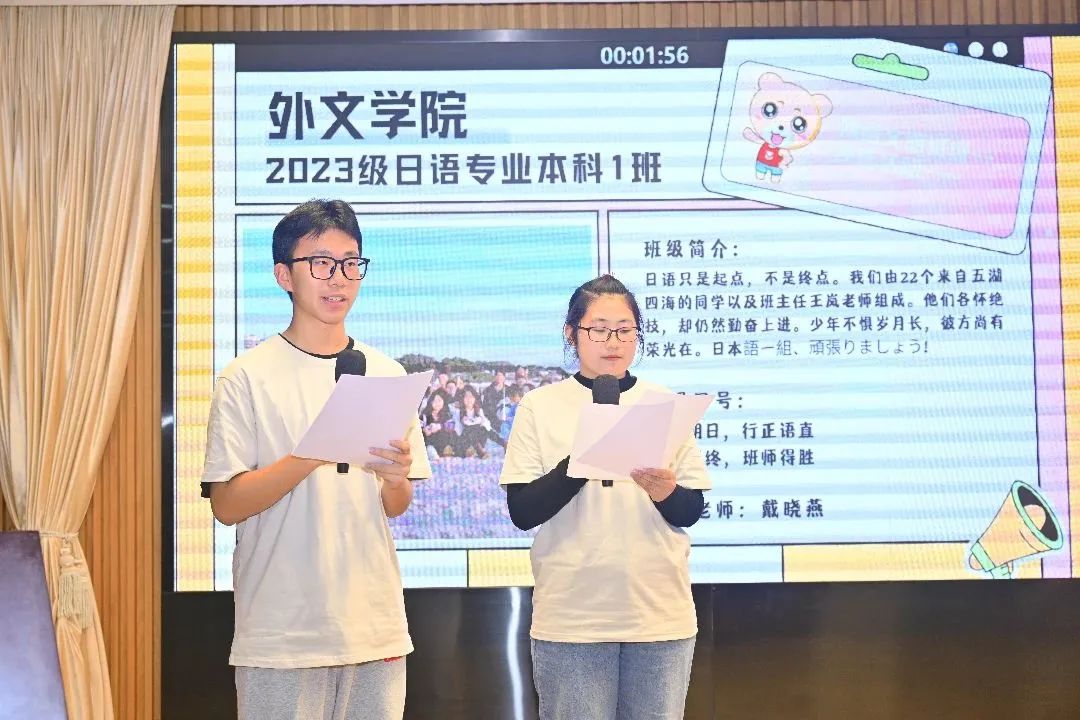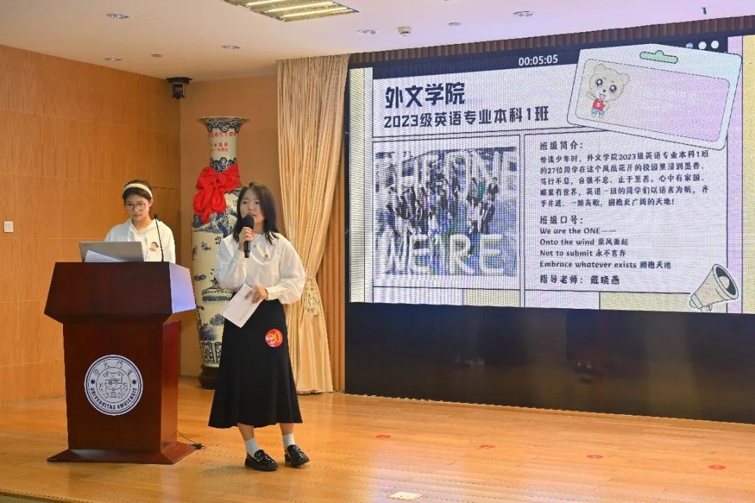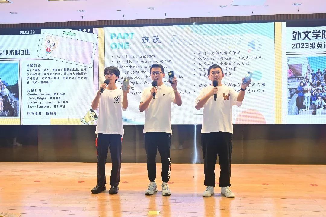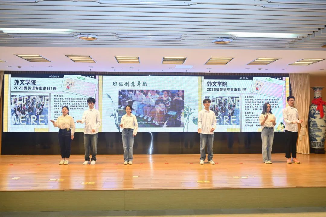 日语一班的班服让人眼前一亮,中心对称的“日语壹班”四个艺术字别具一格,他们的中日交替朗诵也充分展现了专业特色。英语三班的同学,台下活跃在各类比赛和志愿活动中,台上大展歌喉与舞姿,展现了全面发展的班集体。英语四班别出心裁,班徽融入厦大吉祥物与凤凰花等元素,同学们合唱《有我》歌颂未来梦想,展现青春风采。英语一班以短视频的形式展现了班级朗诵诗文、团建出游、积极运动的日常学习生活,最后同学们还现场展示了独创的班级手势舞,体现了活力十足、精神饱满的班级风貌。