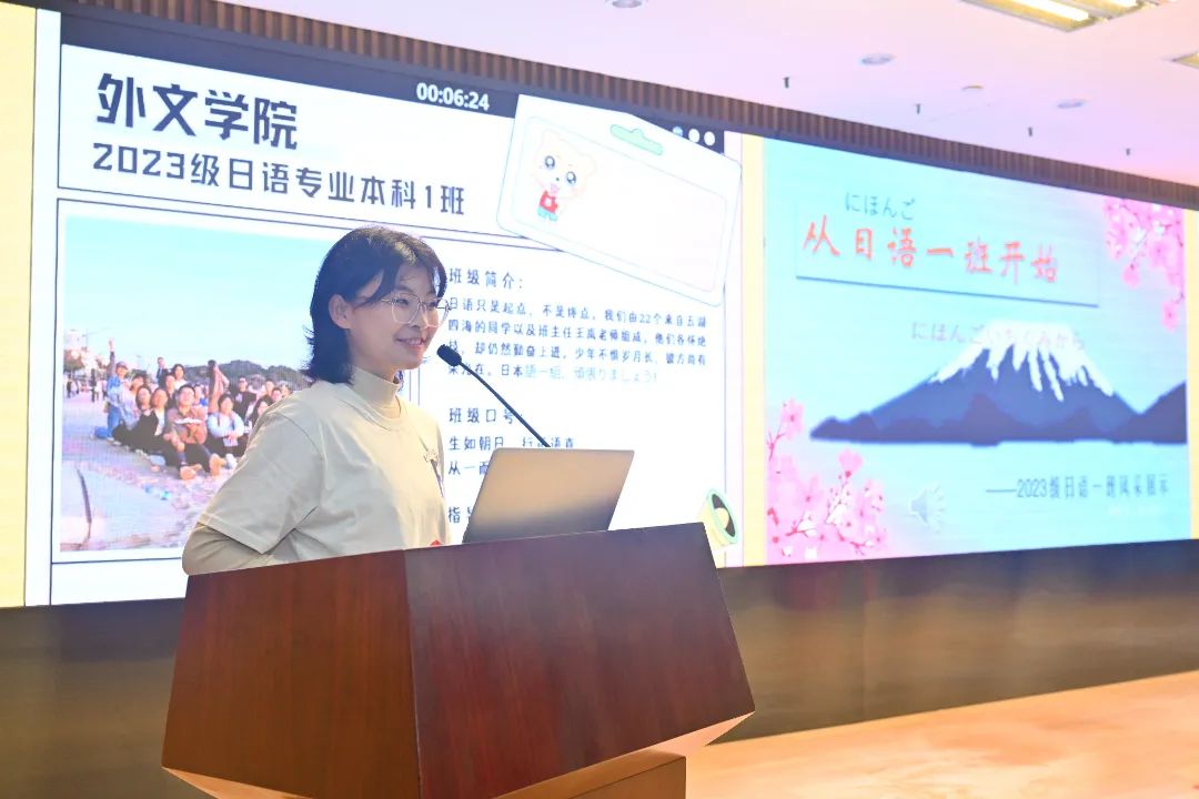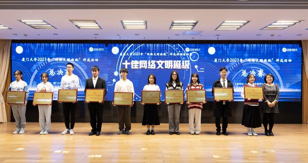12月10日上午,厦门大学2023年“网络文明班级”评选活动总决赛在科学艺术中心一楼多功能厅举行。经过初赛、复赛的激烈比拼,全校共20个班级脱颖而出进入总决赛,其中包括外文学院的4个本科班级。最终,2023级英语专业一班、三班荣获“十佳网络文明班级”,日语专业一班、英语专业四班荣获“优秀网络文明班级”,4个班级也同时被授予“厦门大学优良学风建设试点班级”,戴晓燕老师荣获“优秀指导老师”。
