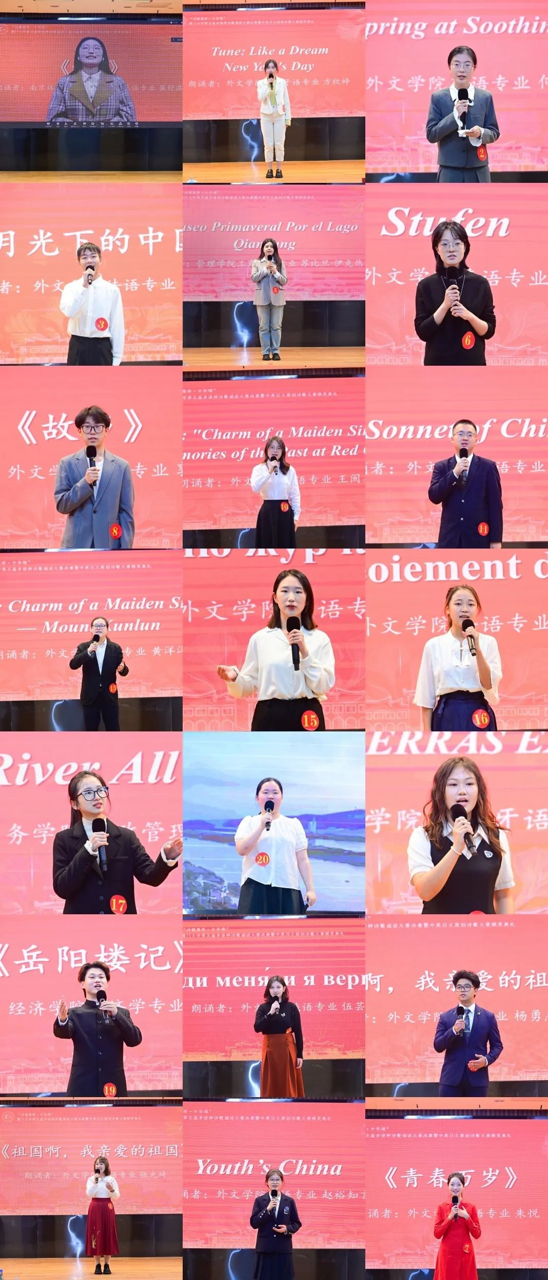 决赛中,选手们用悠扬美妙的诗歌深情讴歌伟大的祖国。75年前,新中国的曙光初现,历经风雨征程,中华民族屹立于世界民族之林。今天,青年学子以青春之力量,触摸历史的心跳,歌颂盛世华章。杨勇杰同学深情朗诵《祖国啊,我亲爱的祖国》,跨越时空的回响,讴歌“甘将热血沃中华”的爱国心、爱国魂。史博文同学用一首《月光下的中国》声情并茂地描绘了月光下的中国的宁静、温柔与强大力量以及古老与现代交织的壮丽图景,以真挚的情感抒发了对祖国的美好愿景。王闽柔同学诵读Tune: "Charm of a Maiden Singer"Memories of the Past at Red Cliff,将对人生变幻无常的潇洒之感抒发得淋漓尽致,传扬着中华民族独有的人文情怀。赵裕知言同学的Youth‘s China表达了广大青年爱国拳拳之心。伍芸萱同学的俄语诗朗?Жди меня?, и я верну?сь?韵律优美,传达了对和平的珍爱。施雨宁同学带来的法语诗?Le rougeoiement du fleuve?激昂慷慨,演绎了作者收复山河的壮志豪情。