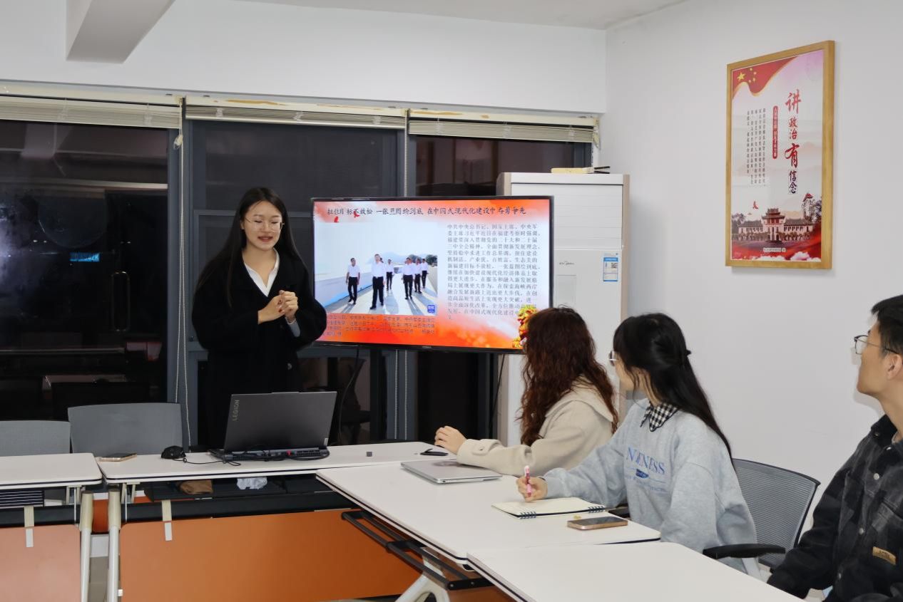 在团支部集体学习后,2022级本科英语二班团支部吴思涵同学分享了自己学习感受,“习近平总书记深入社区、企业调研的场景令我深受触动。他躬身示范的务实作风启示我们:理论学习必须与实践相结合。通过对照‘五个抓落实’要求,我深刻反思自身存在的理论学习碎片化、实践能力待提升等不足。未来,我将定期研读政策文件、积极参与社会调研、主动承担学生骨干责任、自觉传播党的创新理论,努力将所学的理论知识和专业知识应用于日常生活。”