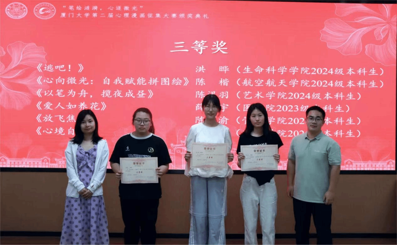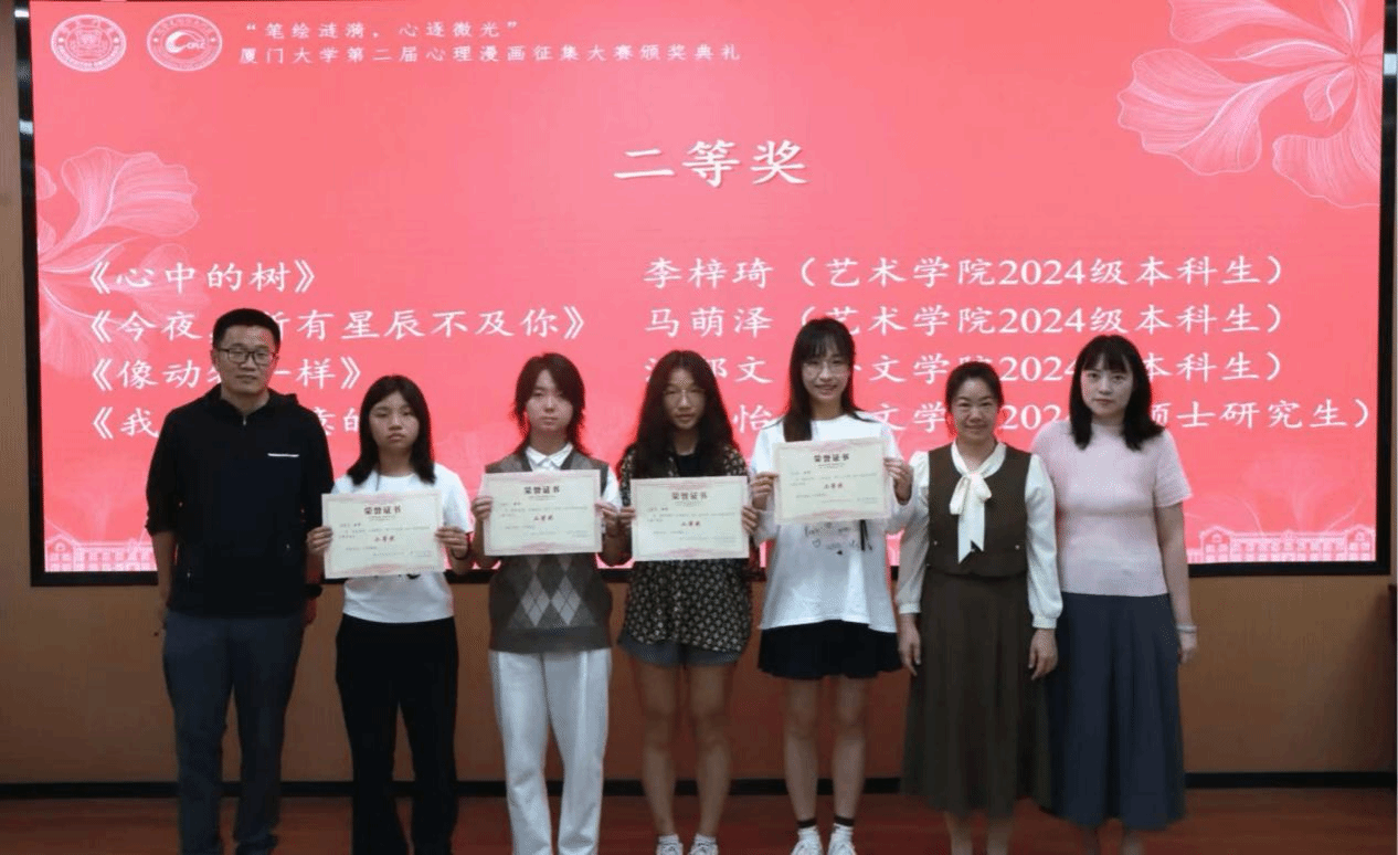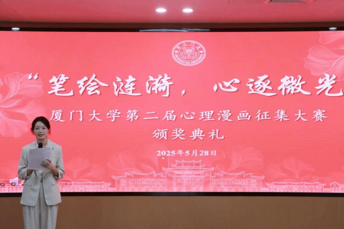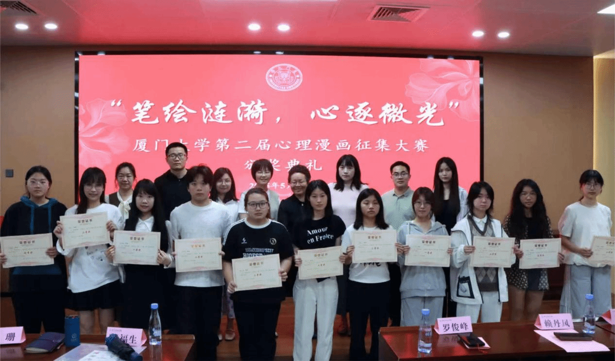 为深化心理健康教育,创新开展“自新、自爱、自律、自强”知行教育,厦门大学外文学院、厦门大学心理咨询与教育中心联合举办“笔绘涟漪·心逐微光”第二届心理漫画征集大赛。经过线上投票和评委评审,大赛获奖名单揭晓,并于5月28日在南光三112报告厅举行颁奖典礼。外文学院党委副书记罗俊峰,心理咨询与教育中心主任赖丹凤、副主任黄福生等多位老师出席活动。