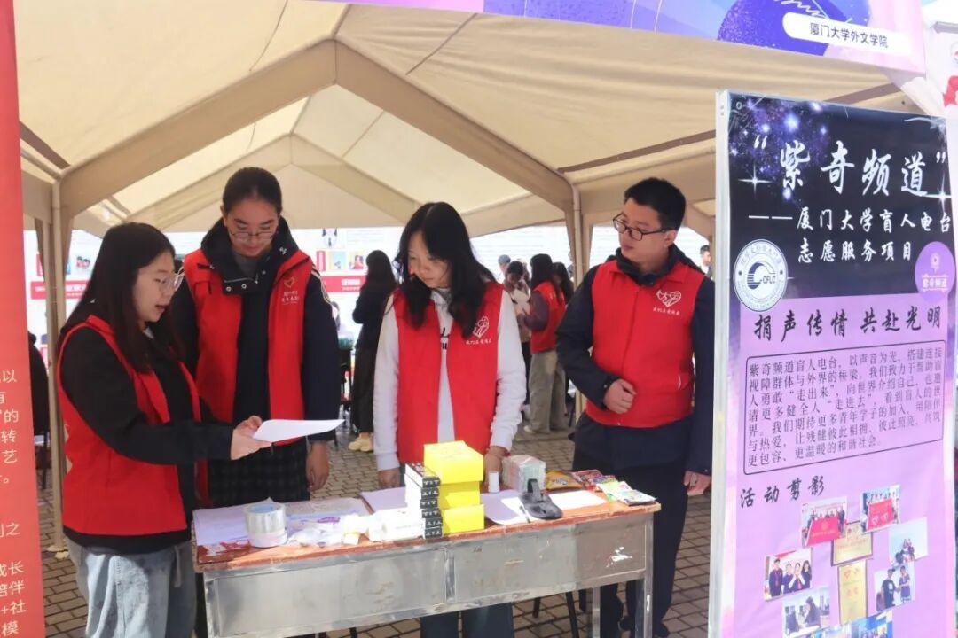 在“传承囊萤薪火,赓续志愿之光”主题游园会中,外文学院青年志愿者协会向全校师生介绍外文学院青年志愿者行动指导中心开展的“紫奇频道”盲人电台活动。志愿者通过录音讲述,音频剪辑,文案排版等工作,用声音帮助视障朋友“看见”世界。该项目曾获第四届中国青年志愿服务项目金奖,第十二届中国青年志愿者优秀项目,厦门大学优秀校园文化成果评选二等奖等众多荣誉。游园会现场,志愿者准备了益智小游戏和丰富的奖品,吸引众多师生参与,宣传了学院的特色志愿服务项目,激发了同学们参加志愿服务活动的热情。