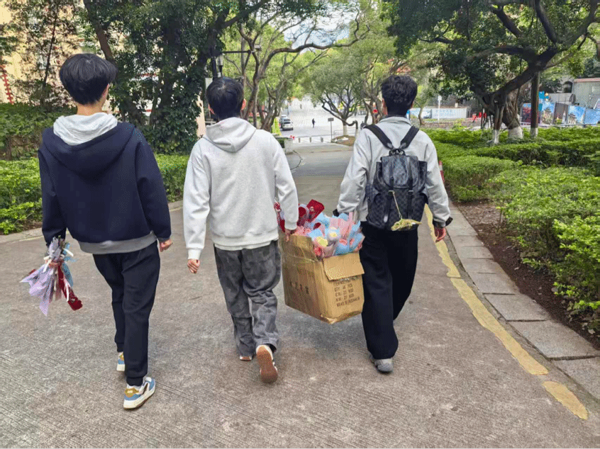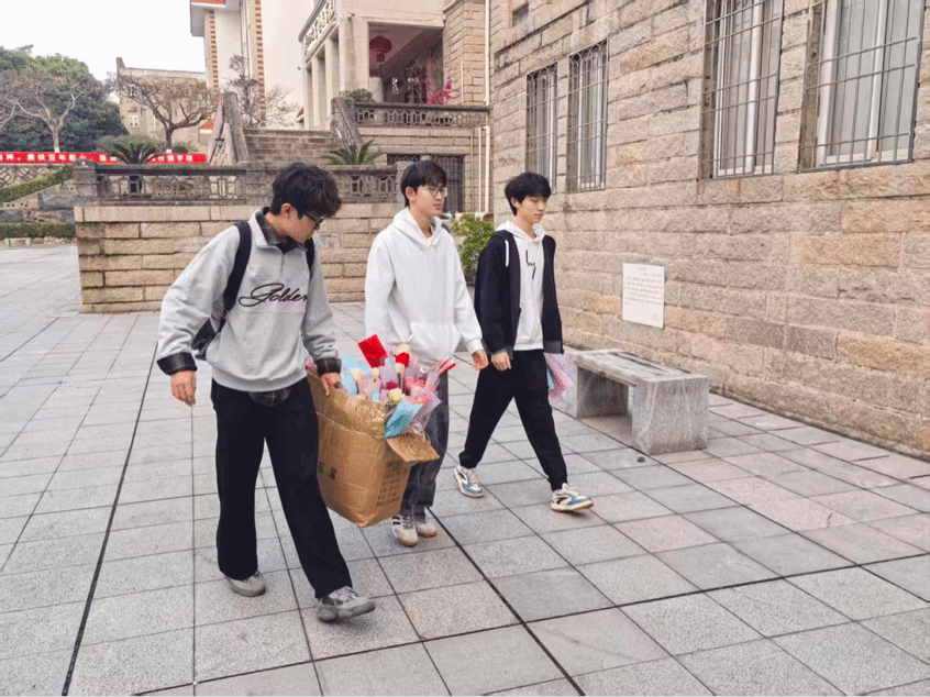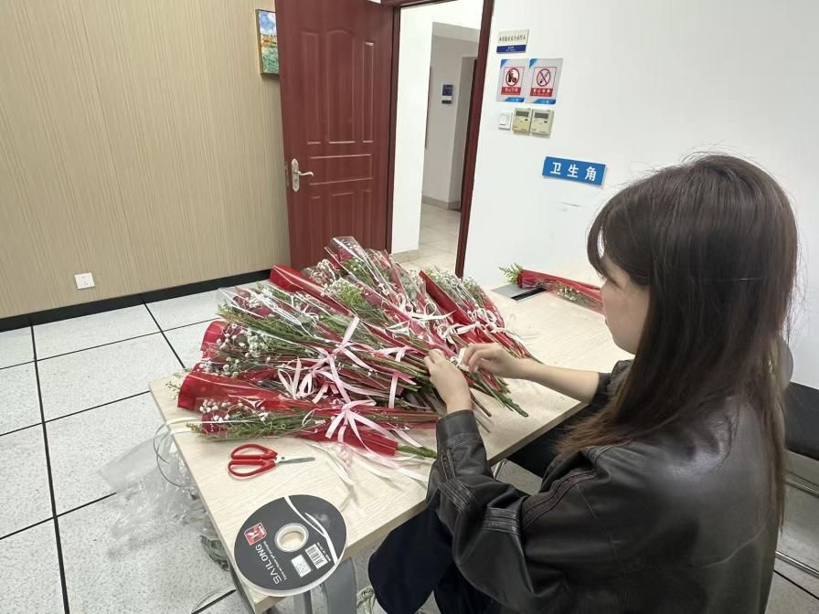 3月6日清晨,晨光熹微,承载着满满祝福,“护花使者”们正式启程 。志愿者们将前一晚包装好的花束悉心分装,分批次送往教学楼和办公室。一路上,大家相互提醒、细心呵护,遇到台阶时更是倍加小心,唯恐惊扰了这份即将送达的美好,将沿途的道路铺满了花香与温情 。
