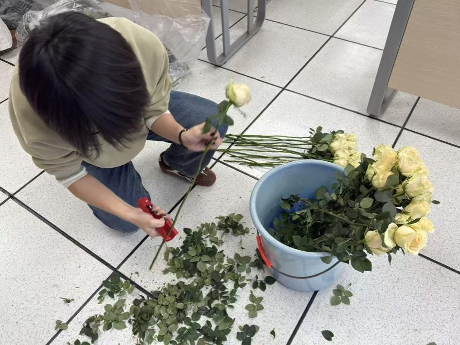 花材运回后,醒花与包装工作随即展开。在学生干部的统筹带领下,志愿者们齐聚一堂,分工合作,有条不紊地投入到花材的筹备与包装工作中。大家围坐于长桌旁,细心且耐心地为每一枝花朵进行醒花、去叶、剪刺与包装。整个过程中,同学们相互协作、细致认真,既保证了花材状态良好,也让每一束花都呈现出整洁美观的效果。渐渐地,一束束饱含心意与祝福的鲜花在桌面上整齐铺展,整个活动室氤氲着醉人的芬芳。
