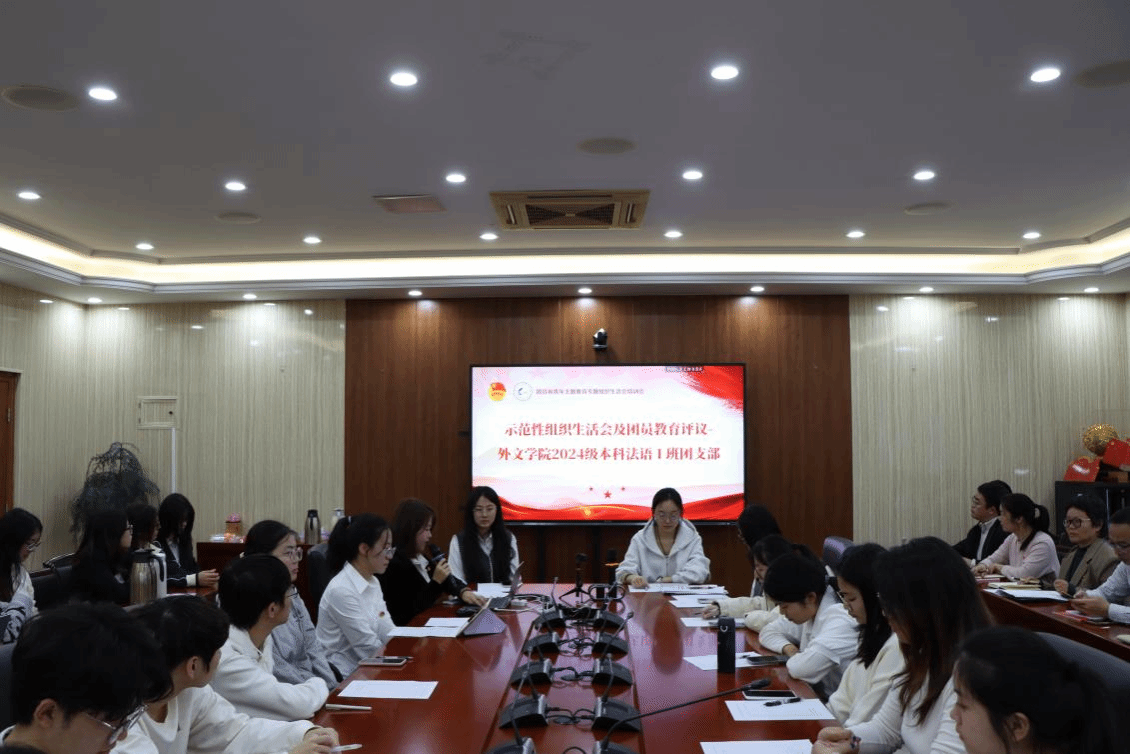 随后,2024级本科法语一班团支部在支部书记王琪玥的带领下开展示范性专题组织生活会。王琪玥带领大家学习党的二十届四中全会精神与团纪知识,紧扣新质生产力、安全与发展、民生福祉三大关键词,结合外语专业特色,明确外文学子可做前沿科技的翻译官、中国创新的代言人、跨界融合的探索者,同时要做到思想、行动、作风“三严”,将专业所长融入强国建设大局。