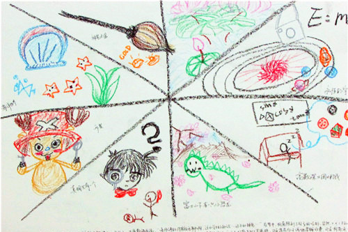 “交替涂鸦说故事”是两人一组、交替作画的互动游戏。在本环节中,同学们的画作风格或文艺清新,或搞怪嘻哈;题材涉及风景画、人物画、Q版画等各种类型,图画中柯南、海贼王、哈利?波特、少年派、小王子纷纷亮相……同学们放下了日常生活中的紧张和压力,在绘画过程中释放自己的激情和活力,创意百出、天马行空,参与热情格外高涨。作画结束之后,老师请同学们相互交流自己的绘画过程,两个小组的同学积极分享了小组创作中的趣事,并以其新颖的创意、活泼的画风赢得了大家的阵阵掌声。