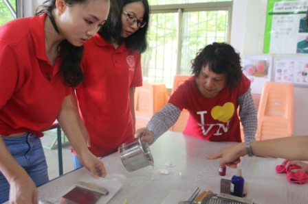 接下来在解说老师们的指导下,制作玫瑰造型的皂心。听老师的讲解,我们以为这应该不难,不料由于我们手法十分笨拙,出来的形状及其僵硬和奇怪,于是求救老师,在老师的妙手之下,一个个鲜艳动人的玫瑰形状跃然手中。老师的手法十分纯熟,在不知不觉中赋予了这些“玫瑰”烟火情长,用纯天然的材质赋予香皂以全新的生命。