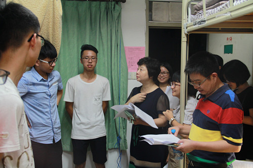 有朋自远方来,不亦乐乎。学院对新同学们的入学、入住情况表示高度关注,领导老师们先后走访了凌云二、芙蓉九这两栋外文学院新生所在的宿舍楼。老师进门后,同学们用热烈的掌声欢迎老师们和学长学姐的到来。领导老师们请每位同学作了自我介绍,并亲切询问他们来自何处、是否习惯住校生活、对大学生活的想法等。老师们还询问了同学们的兴趣爱好,希望大家能够在开学后勇敢地展示自己的特长。同时,领导老师们也向大家再三强调了宿舍安全问题。老师们的和蔼笑容和平易近人的语气使交谈氛围十分轻松,其言谈中句句都流露着对同学们的关切。新生们也都大方地自我介绍,与老师热情地交流。