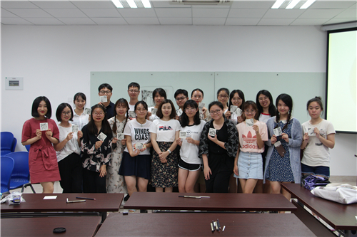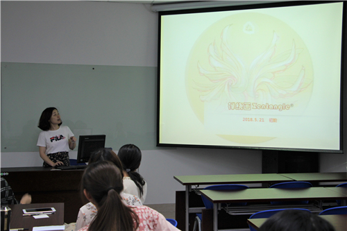 主持人简短介绍过后,活动进入第一环节,李颖老师向大家讲解关于禅绕画的基本知识。禅绕画发源于美国,英文名为Zentangle,得名于日语中的“禅(Zen)”和英语词汇的“缠绕”(Tangle),它画法简单,主要是在有规律重复某一些图样的过程中,让创作者达到既放松又专注的状态,并从中获得平静。禅绕画创作主要分8个步骤,首先是感恩&欣。李颖老师向同学们展示了一些精美的禅绕画作品,画艺精良,色彩丰富,各种复杂的线条和图形相互缠绕,美得让人移不开眼,现场同学发出阵阵赞赏声。李颖老师还让大家仔细观察并触摸上面作画的纸砖,融入自己对“成品”的期待。