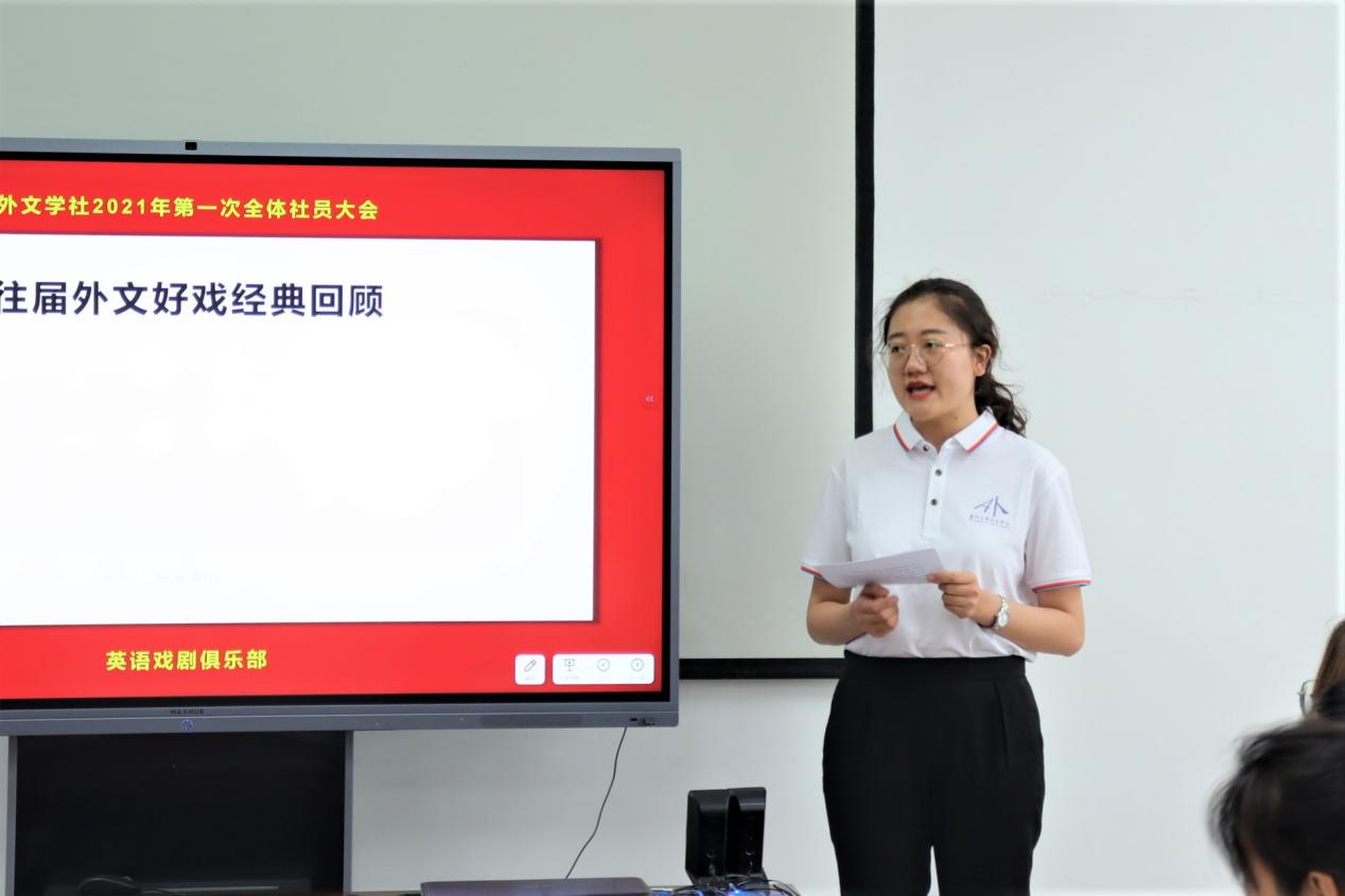 接下来,外文学社下属各俱乐部负责人介绍了各个俱乐部的发展情况与未来发展规划。多语种俱乐部负责人、外文学院2019级英语专业本科生张书萍首先发言,她表示,过去一年里,多语种俱乐部积极开展了法语小课堂、德语小课堂、日语小课堂及英语角四项活动。未来,俱乐部将会继续发扬活动形式多样、氛围轻松、内容充实的优势,积极探索如movie night、优秀外语电影作品展映会、英语诗歌欣赏之夜、英文原著读书交流会等更加丰富多彩的活动形式。