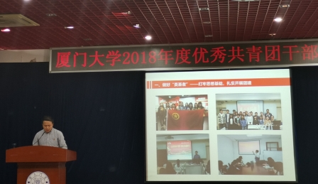 2018年度“厦门大学优秀共青团干部”评选活动于4月17日举行。外文学院辅导员蔡宇老师在个人展示中以“共青团干部应做好奠基者、引路人、排头兵”为题,分享了自己的工作经历与感悟。作为一名共青团干部,他努力打牢团员思想基础,扎实开展团建,着力提升学生的政治素养和时代责任感。同时,他努力挖掘育人要素,不断拓展团学活动,以学术竞赛、社会实践、志愿服务、文体活动等为依托,用多样的形式、丰富的内容培育学生、引领学生、成就学生,做好“引路人”。他始终以学生组织为抓手,不断提升团组织的凝聚力,培育了一批优秀的学生团员骨干和群体,切实发挥了“排头兵”作用。他表示,今后将继续努力提升自我,引领教育青年团员成长成才,助力广大青年学子有梦、追梦、圆梦。最终,蔡宇老师成功获评“优秀共青团干部”称号。