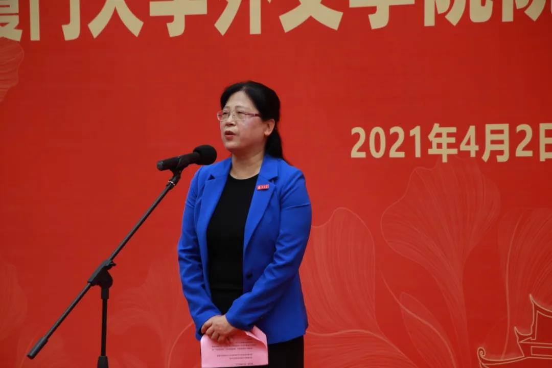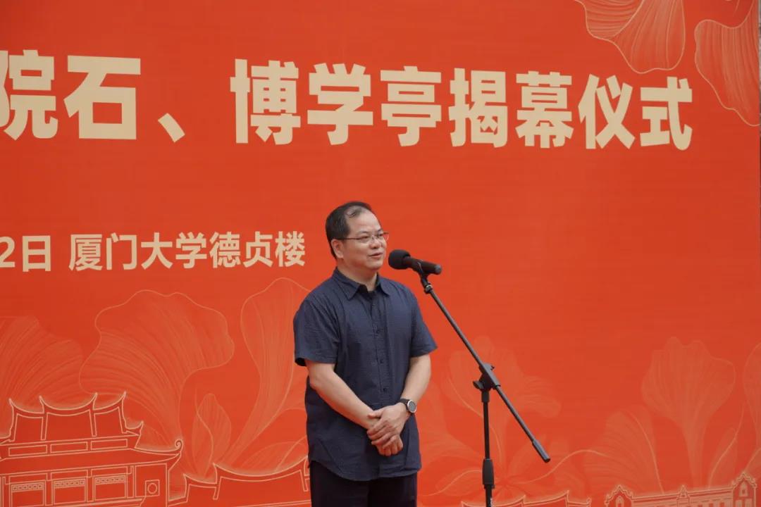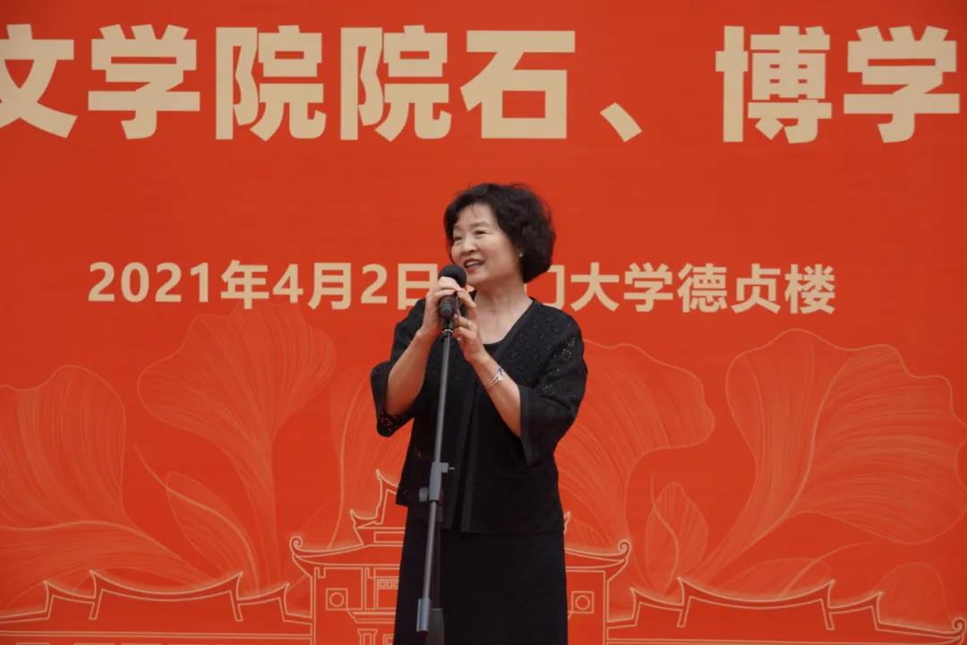 詹心丽副理事长为揭幕仪式致辞。她代表校友总会对外文校友慷慨捐资、襄助母校事业发展的善举表示高度赞誉和衷心感谢,并希望通过此次外文学院院石、博学亭揭幕仪式进一步凝聚校友力量、弘扬嘉庚精神,奋进厦大百年新征程。