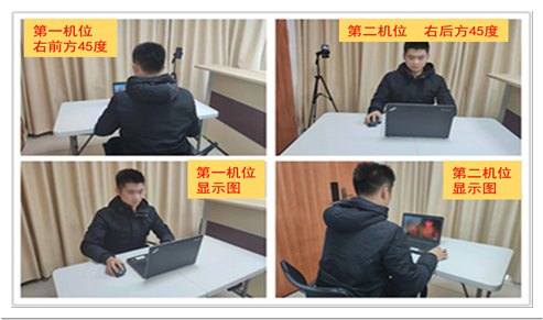 监控机位摆放及效果如图所示(惯用手为右手),监控机位1即为第一机位,监控机位2机位第二机位: