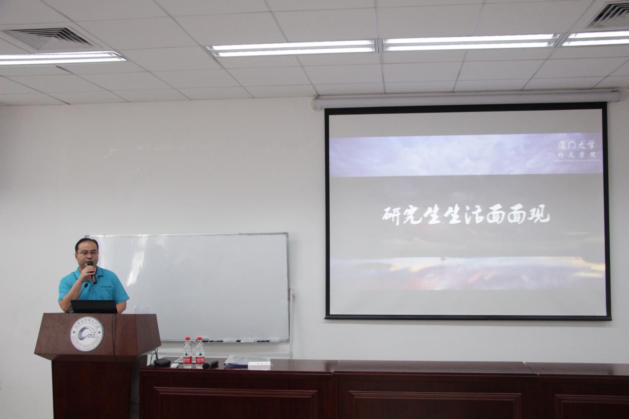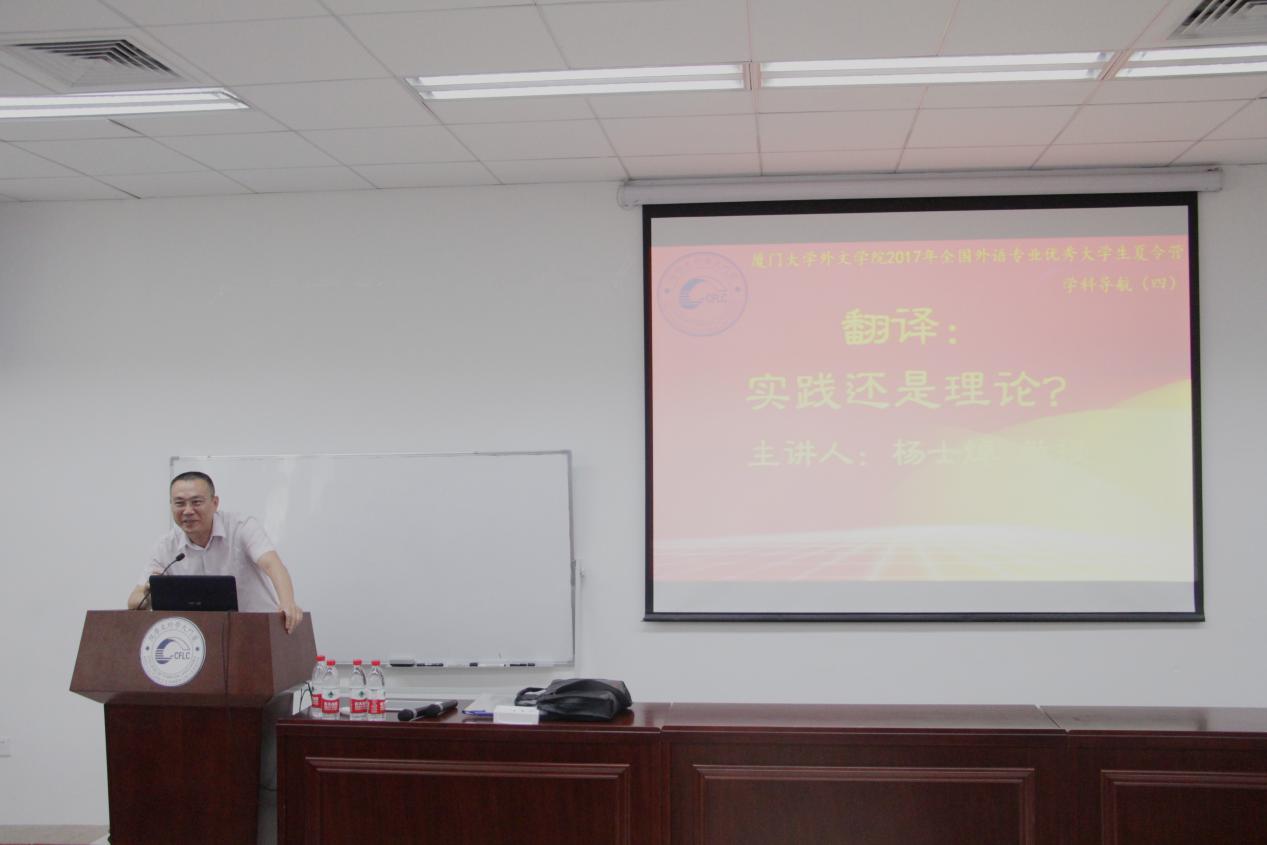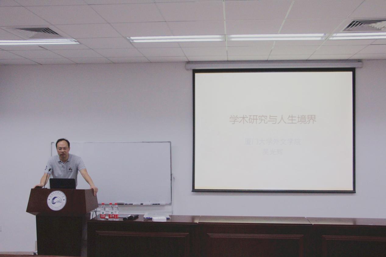 外文学院院长张龙海老师为营员们带来主题为“文学与人生”的讲座,结合自身求学和作经历,围绕“胸怀梦想、明确目标”、“脚踏实地、全力以赴”、“品德为先,强壮体魄”三个标题进行讲述。外文学院副院长辛志英老师鼓励营员培养批评思维,注重研究方法的积累;建议做研究时要“勤问问题”,“善问问题”,运用头脑风暴,培养想象力并注重学识的培养。日语系系主任吴光辉老师以王国维的“成大事业、大学业必过三种境界”鼓舞大家去尊重学术,教导大家要在大历史背景下和在全球观地域文化的不同影响下,懂得如何展现自己,秉承赤子之心,全力以赴做好研究。英语系系主任杨士焯老师开展了主题为“翻译:实践还是理论?”的讲座,杨老师以翻译实例为例,旁征博引中外翻译大家的理论观点,引导大家树立正确的翻译理念、培养良好的翻译素养,并指出翻译学习要理论与实践相结合。此外,外文学院团委书记、研究生辅导员乐无恙老师和研究生教学秘书邹柳新老师向大家介绍了研究生生活的方方面面,帮助大家更加直观地了解到外文学院的研究生生活。