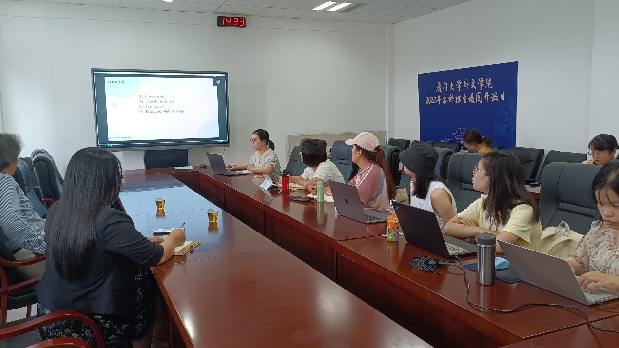 陈晓冉首先报告了她在香港城市大学期间的学习成果,然后对博士学位论文的选题、文献综述、理论框架、研究方法等方面作了详细汇报。