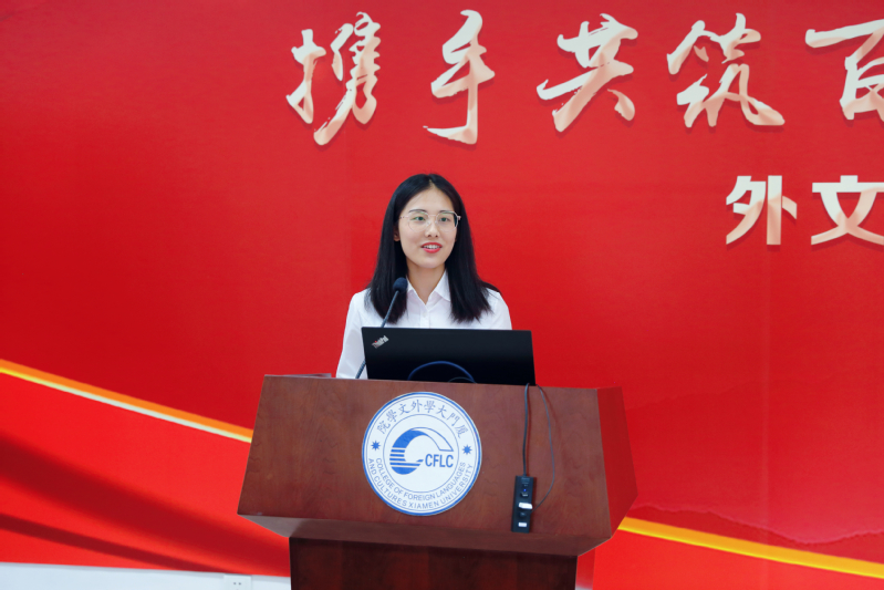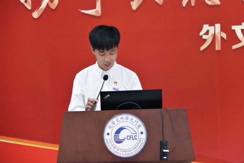 活动在慷慨激昂的国歌声中拉开帷幕。今年恰逢建党100周年,六位毕业生党员代表首先带来诗朗诵——《我爱你——中国共产党》,充分表达了对党的无限热爱和深情告白。同时,他们也用六种语言为中国共产党成立一百周年献上了最诚挚的祝福。