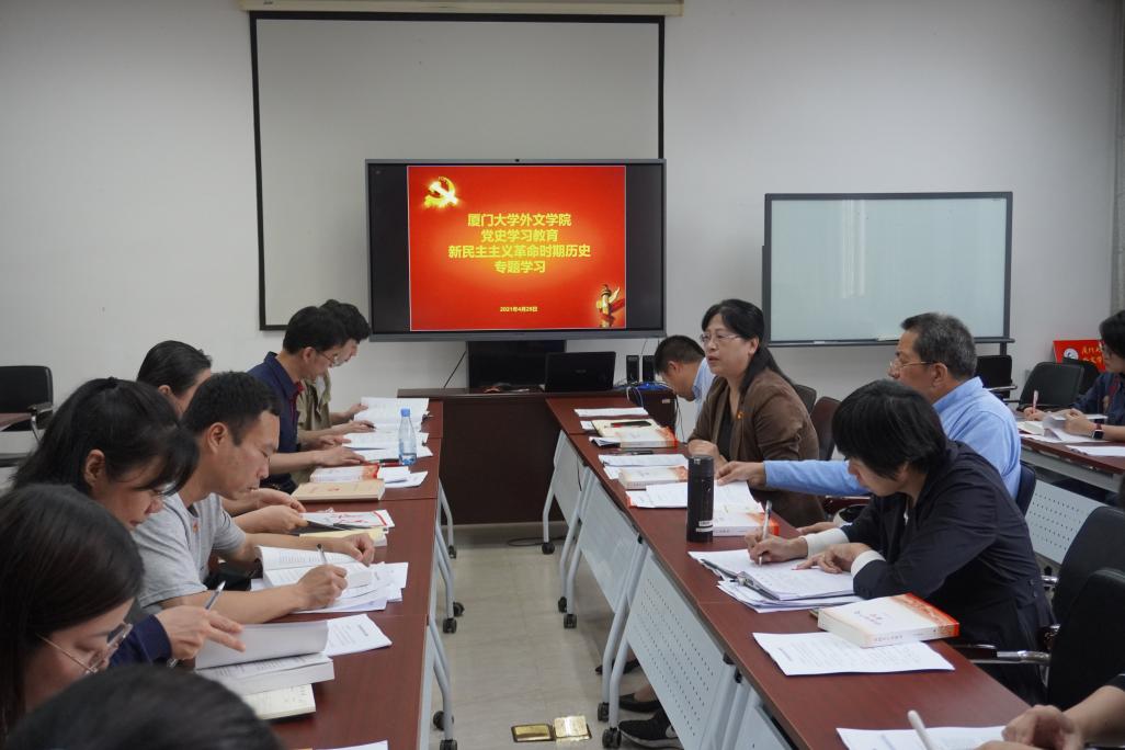 4月28日下午,厦门大学外文学院以党委(扩大)会暨党支部书记工作例会的形式开展党史学习教育“新民主主义革命时期历史”专题学习,并学习贯彻4月22日中共中央印发的《中国共产党普通高等学校基层组织工作条例》等上级文件精神。校基层党建工作联络员黄定基、外文学院党员领导干部、党委委员、党支部书记和副书记参加了学习。学习会由学院党委陈志伟书记主持。