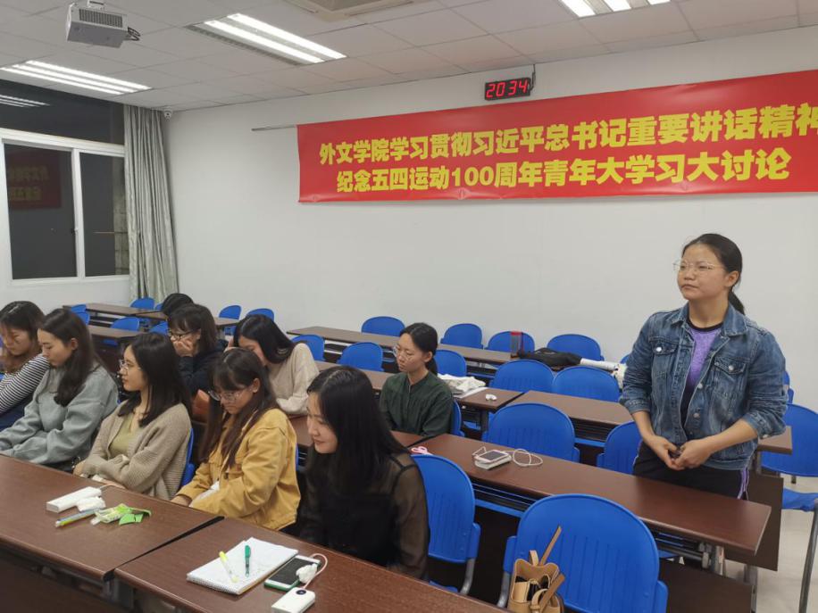 为纪念五四运动一百周年,5月6日晚,为纪念五四运动一百周年,外文学院翻译硕士党支部以“五四百年,薪火相传”为主题开展5月的“固定当党日+”活动,组织支部党员学习习近平总书记在纪念五四运动100周年大会上的讲话精神,重温五四历史,体会五四精神。