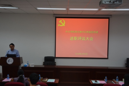 为贯彻习近平总书记关于落实全面从严治党责任、加强党的基层组织建设的重要指示精神,按照校党委的统一部署,3月5日下午,外文学院党委在南光三112报告厅举行本学期第一次“固定党日+”活动暨2017年度党支部书记抓基层党建述职评议大会。校党委组织部副部长廖志丹与外文学院党委成员、学院关工委负责人、学院部门工会、团委、妇委会负责人和代表、民主党派代表、师生党支部书记、副书记、支委以及党员一同听取了12位师生支部书记的现场述职。会议由外文学院院长、党委副书记张龙海主持。