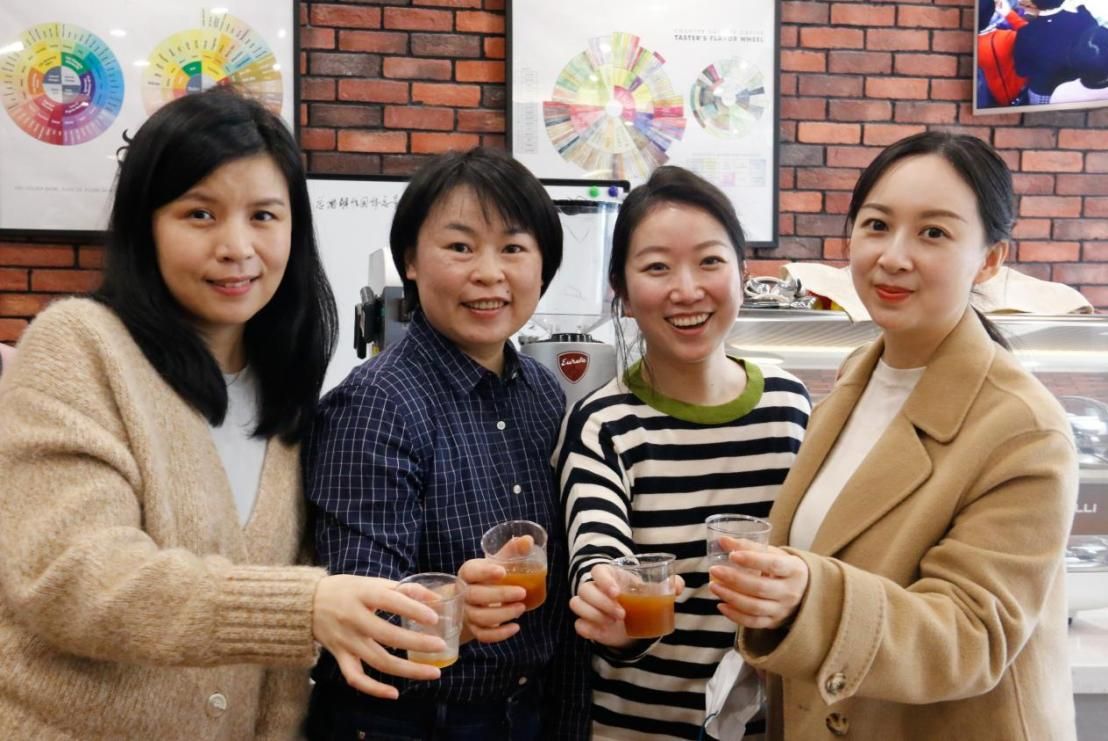 咖啡拉花对技巧要求更高。师生们不仅享受了一场干货满满的咖啡文化课,了解到咖啡的诞生、物理化学特性、地理分布、种类划分,更是在培训老师的指导下,亲手打磨咖啡豆、萃取咖啡、打发奶泡,勾勒出一朵朵别有趣味的花纹。指导老师为大家讲解咖啡的制作过程,他告诉大家,“我希望你们是真的热爱,把它当成一门艺术,而不是谋生手段”,引起了现场不少老师的共鸣。一朵朵精致的拉花浮现在杯中,香气氤氲,“女神”们手捧着自己精心制作的咖啡,尽情享受着午后悠闲的美好时光。