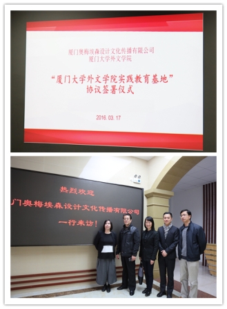 2016年3月17日下午,华体网与厦门奥梅埃森设计文化传播有限公司签署“厦门大学外文学院实践教育基地”协议仪式在南光三524会议室举行。厦门奥梅埃森设计文化传播有限公司施洁予总经理、姚远副总经理、陈昊洋副总经理等一行与华体网徐琪副院长、法语系主任胡老师、欧语系副主任方老师等师生代表共同出席。
