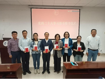 讲座正式开始前,外文学院党委举行“党的二十大学习用书授书仪式”,校基层党建工作联络员黄定基、学院党委副书记张胜强分别为党支部书记代表发放党的二十大报告单行本和新修订的《中国共产党章程》,引导师生党员原汁原味、逐字逐句地学习,把听取专家解读与认真开展自学相结合。