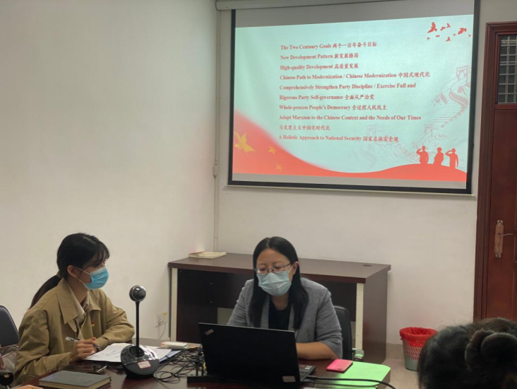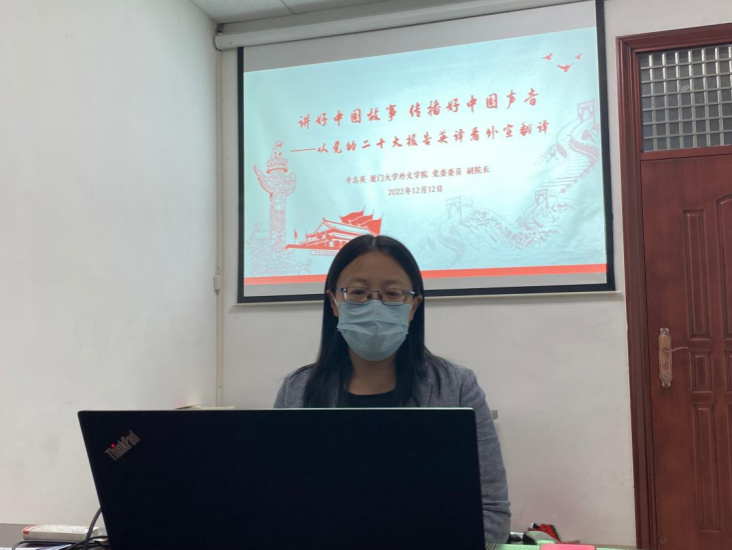 为深入学习宣传贯彻党的二十大精神,外文学院翻译硕士党支部于12月12日下午召开“固定党日+”活动,邀请外文学院党委委员、副院长辛志英教授为党支部讲题为“讲好中国故事,传播好中国声音”学习贯彻党的二十大精神专题党课。支部全体党员参加活动。