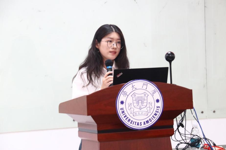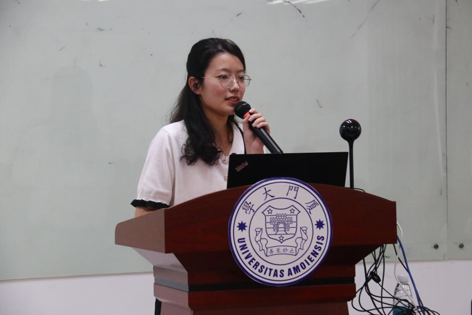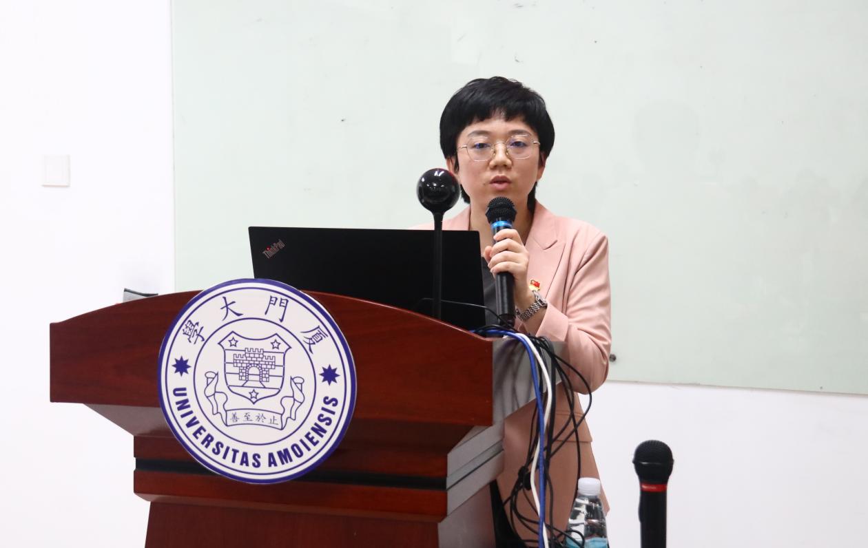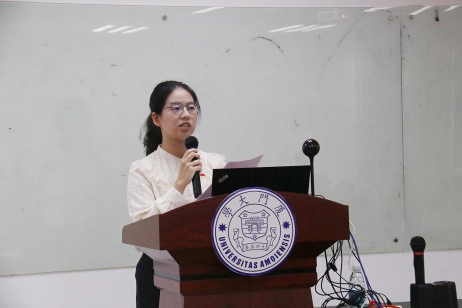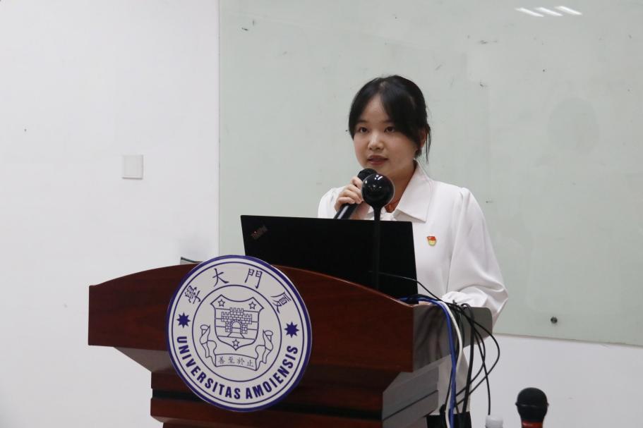 四位优秀学生党员代表依次分享了她们的奋斗故事和所思所悟。厦门大学第六期“扬才班”学员、外文学院翻译硕士党支部书记、研究生会执行主席张诗怡以“一枚党徽”“两种身份”和“千重责任”为切入点,回顾自己的入党过程和志愿服务、社会实践、学业竞赛、学生干部等经历,勉励入党积极分子发挥新时代青年优势,担负起时代责任;厦门大学第六期“扬才班”学员、外文学院2023级硕士生第三党支部书记徐诺用“博学笃志,虚心求学练内功”“多方服务,尽职尽责敢担当”和“造炬成阳,志愿沃土勤耕耘”分享了自己作为青年党员走出的特色成长道路,在未来的发展中,她将不忘初心,砥砺前行;2021级英语专业本科生周妍围绕“尝试”“坚持”和“热爱”三个关键词分享了她在大学期间的成长历程,饱含着对国家的热爱,得益于自身的出色能力,毕业后她将坚定投身我国外交事业;2021级英语专业本科生、2023-2024学年外文学院本科生团总支书记钟宛余以“让青春在实践中绽放绚丽之花”为分享主题,激励各位入党积极分子在实践中锻炼能力、在服务中体现价值、在创新中实现发展、在党旗下坚定信念。