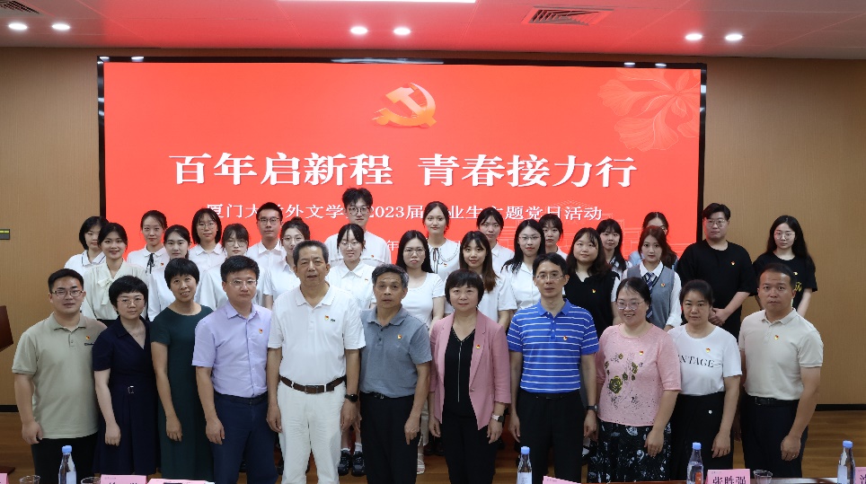 为深入开展学习贯彻习近平新时代中国特色社会主义思想主题教育,勉励毕业生党员不忘初心,弘扬伟大建党精神,在学院党委的精心策划和学院团委悉心指导下,6月14日,“百年启新程 青春接力行”厦门大学外文学院2023届毕业生党员主题党日活动顺利举行。本次活动由外文学院2020级学术硕士党支部、翻译硕士党支部以及各本科生党支部联合承办。