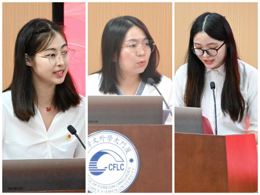 受到表彰的优秀共产党员代表黄妍艳、先进党支部代表孔雯、优秀党务工作者代表付心雨讲述了自身的奋斗故事,分享了党建工作经验和感悟。他们以勇挑重担、苦干实干、无私奉献谱写共产党员的初心使命与责任担当,正是这样一批敬业奉献的党员和尽职尽责的党务工作者,为外文学院的党建工作和事业发展奠定了坚实的基础。