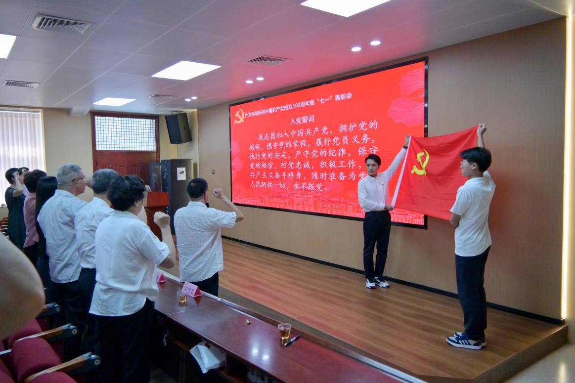 在入党宣誓环节,老党员雷天放老师带领新发展党员进行入党宣誓,其他党员重温入党誓词。党员们以铿锵有力、掷地有声的誓言,表达了对党的无限忠诚和为共产主义事业奋斗终身的坚定信念.