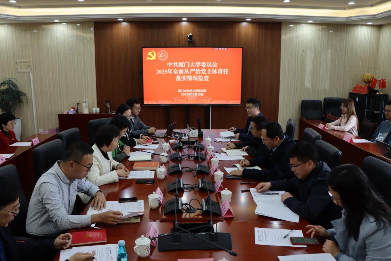 12月19日下午,厦门大学党委常委、副校长吴超鹏带领校党委2025年全面从严治党主体责任落实情况第七检查组赴外文学院开展检查指导工作。校党建办主任兼组织部副部长、教师工作部副部长葛郝锐,校党委教师工作部副部长葛学凤,校学生工作部(处)副部(处)长兼学生公寓学生工作办公室主任、人民武装部副部长陈国全,校党建办秘书林志伟参加检查。外文学院党政班子成员、党支部书记和党员代表参加汇报会及座谈会。