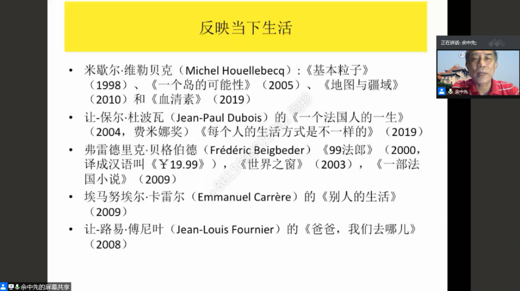 余教授指出,反映当下生活仍是文学写作的主流,但种种的创新手法寓于传统和经典模式中。现代派之后的某种所谓的“回归”现实,“回归”经典,已经带上了现代派的痕迹。如果从文学与社会的关系来看,新世纪二十年的文学作品必定反映出现代社会的一些特点。法国当下社会的特点有:欧洲一体化,欧元,无边界;互联网,数字化;移民问题,恐怖袭击等。当下文学也随之出现了一些新的特点:作家生存比较困难,寻求赞助;网络写作日趋盛行等。余教授认为,当下法国文学总的趋势是处于某种“克制”当中:语言规范化,重返情感同化,虚构记忆,驱逐死亡。余教授继而举出了一些关注现实问题的代表性作家:被法国文坛称为“坏小子”的米歇尔·维勒贝克和弗雷德里克·贝格伯德,前者代表作有《基本粒子》、《一个岛的可能性》、《地图与疆域》等,矛头直指法国社会,批判锋芒锐利;后者代表作有《99法郎》、《世界之窗》、《一部法国小说》等,亦对现实充满讽刺和自嘲。还有让·保尔·杜波瓦的《一个法国人的一生》,将个人的生活经历与法国社会的历史大背景紧紧结合在一起,对现代社会进行重构。其他的作品如:进行自我反省——奥利维埃·罗兰的《纸老虎》,传统作家——端木松及艾克托尔·比安科试图重构,社会新闻(重构)——雷吉斯·若弗雷《疯人院》和贝松《十月的孩子》,都涉及到历史与现实的种种问题。