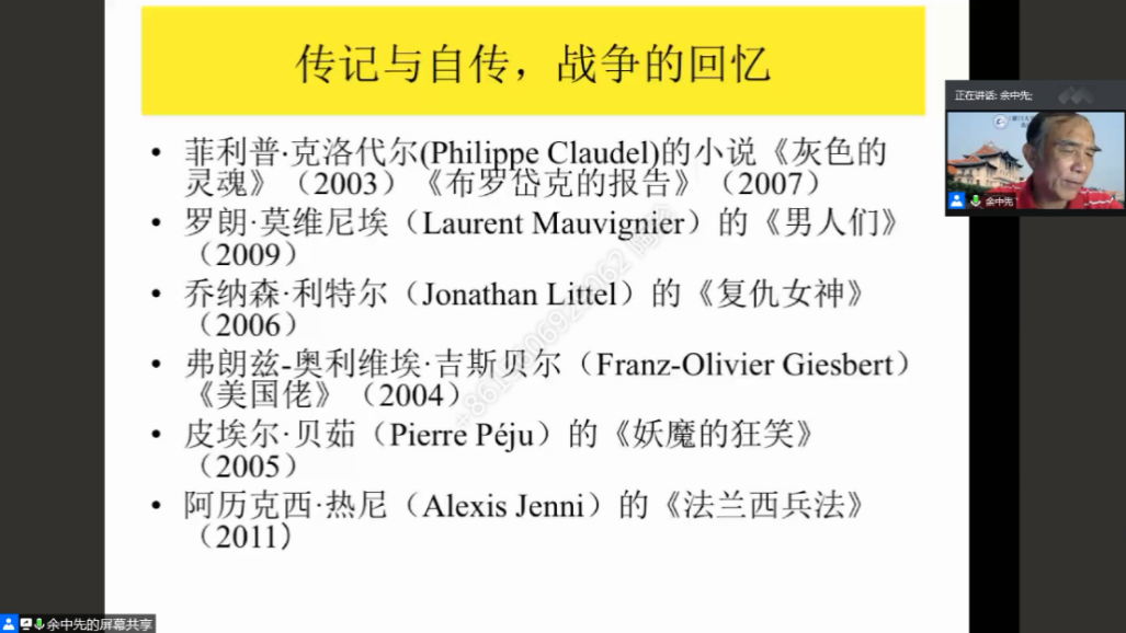 余中先教授的演讲结束后,讲座主持人鲁京明教授对本场讲座的内容做了精辟的总结,讲座与谈人、厦门大学外文学院讲座教授刘成富教授也进行了精彩的点评,并在新世纪法语文学与战争的关系、文学中关于生与死的思考、法语文学的构建等方面发表了自己的见解,同余中先教授做了进一步的交流和对话,令云端的广大听众深受启发。