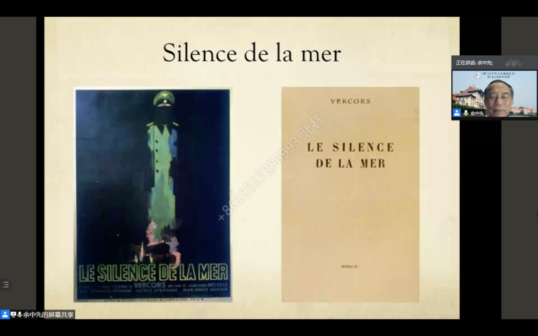 接下来,余教授简单介绍了纪尧姆?阿波利奈尔(Guillaume Apollinaire)的作品,认为其在《远距离接触》中用科学仪器把自己的形象反馈到欧洲乃至世界各地,这种“互联网想象”正如同当今我们通过会议直播平台把知识分享到世界各地。关于二次大战与《海的沉默》,余教授给予了特别强调。维尔高尔本名让?布吕莱,其作品《海的沉默》几乎可以说是抵抗文学的旗帜、象征、代表,这不仅因为在当时是地下出版的,而且因为其作品体现出了一种高于一般爱国主义的人性精神。