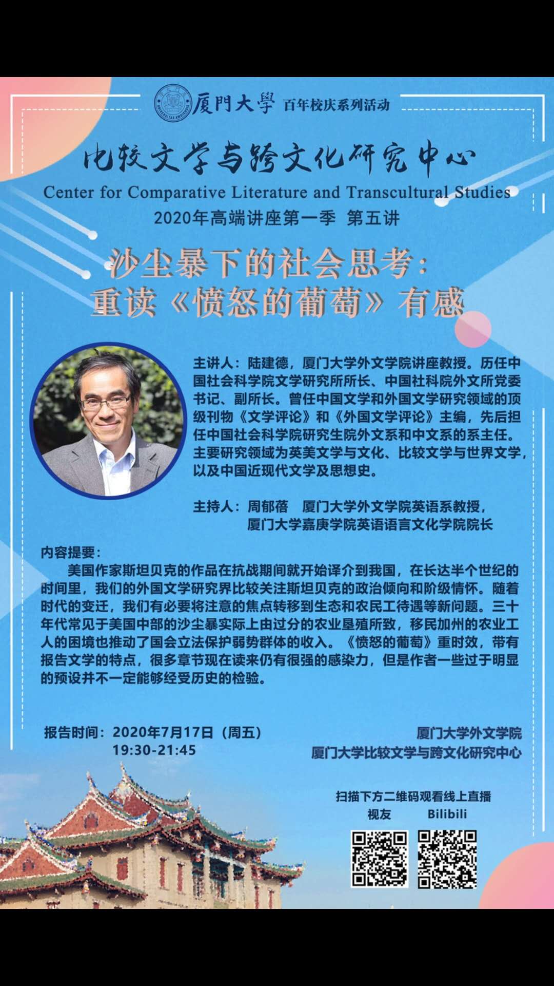 2020年7月17日,厦门大学比较文学与跨文学研究中心的“美美与共:比较的意义”高端系列讲座第五讲“沙尘暴下的社会思考:重读《愤怒的葡萄》有感”在“腾讯会议”如期而至,B站、视友两大平台全球直播。中心主任陆建德教授围绕诺贝尔文学奖获得者、美国作家斯坦贝克的名著《愤怒的葡萄》,给听众带来了一场基于“沙尘暴”视角的比较文学“头脑风暴”。陆教授讲座抛出的诸多问题,如美国三十年代的沙尘暴与北京今年5月的沙尘暴有何联系?美国上世纪二、三十年代经济危机农民逃荒西迁与中国现代化进程中的农民工进城有何异同?比较视野能为重读文学经典打开什么局面?外国文学研究者自身的学养与经历如何与外国文学文本相结合?对从事文学批评的学者有诸多启示。陆教授的讲座,如主持人厦门大学英语系周郁蓓教授的点评,“跳出类型的多样性”,春风化雨,从云端给我们撒下思想的“沛雨甘霖”。