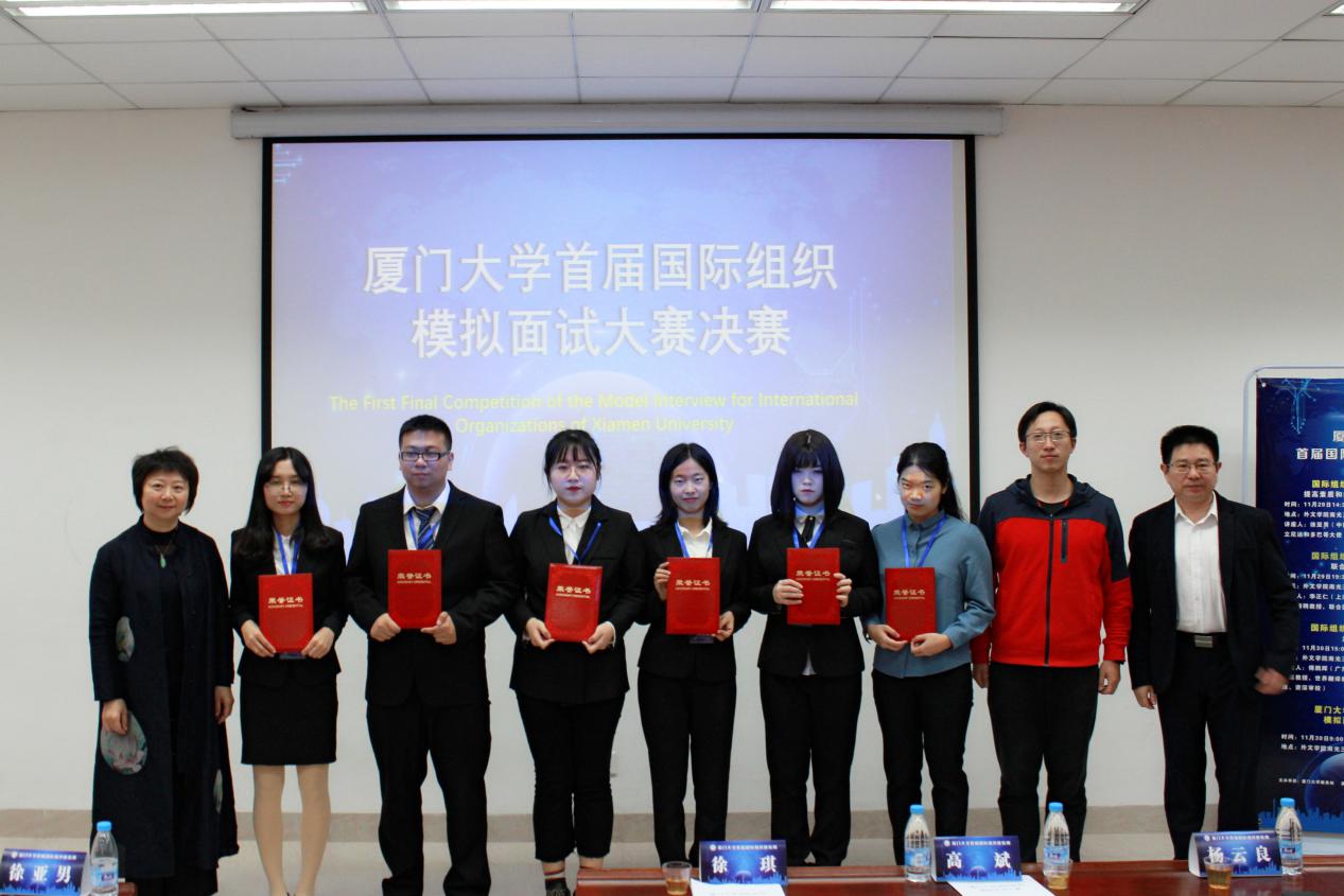 11月30日上午,厦门大学首届国际组织模拟面试大赛决赛如期开赛。徐亚男大使、李正仁教授、傅鹏辉教授应邀出席并担任评委,校学生处副处长高斌,外文学院党委副书记杨云良、副院长徐琪出席本次活动并为获奖选手颁奖。