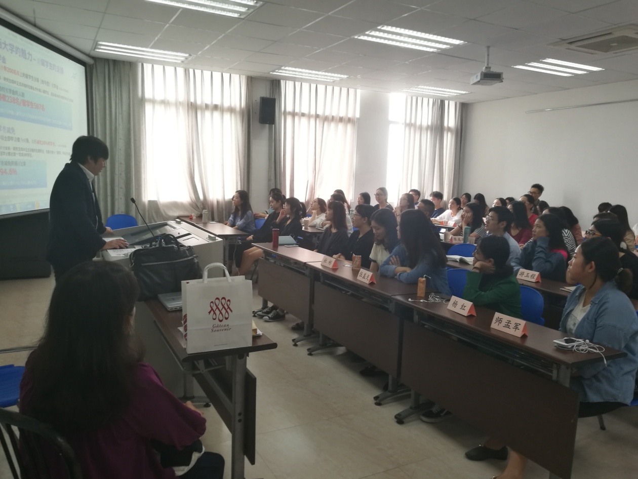 古川智树副教授以关西大学的介绍作为开场,向在座的师生们讲述了关西大学的学院构成、学科设置和留学政策等相关信息,并亲切地表示非常欢迎外文学院日语语言文学系的同学去关西大学进行留学交流。同时,在座的日语语言文学系同学对此次讲座展示出了极大兴趣,讲座现场座无虚席。