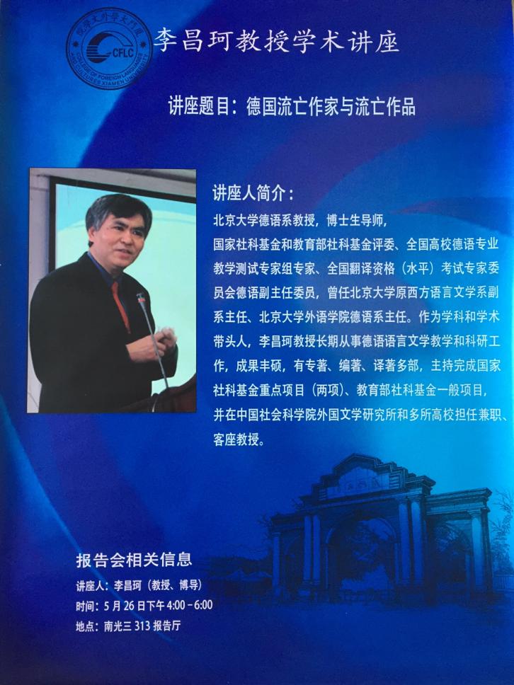 2017年5月26日下午4时,北京大学德语系教授、博士生导师李昌珂教授应邀在南光三313报告厅为外文学院欧语系德语专业的师生作了一场以“德国流亡作家和流亡作品”为题的讲座。欧语系副主任方厚升教授主持本次讲座,华体网德语专业全体教师、法语系部分老师到场共享文学魅力。