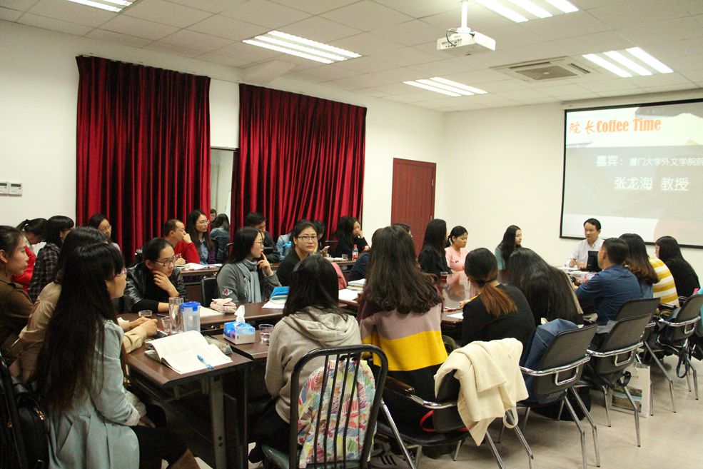 11月30日晚7点,由厦门大学外文学院主办,外文学院研究生团总支、研究生会承办的第十三期院长Coffee Time活动在南光三319会议室顺利举办。此次活动的嘉宾是外文学院院长、博士生导师、教授张龙海老师。外文学院近40名硕士、博士生围桌而坐,同院长面对面探讨学术,畅聊人生,收获颇多。