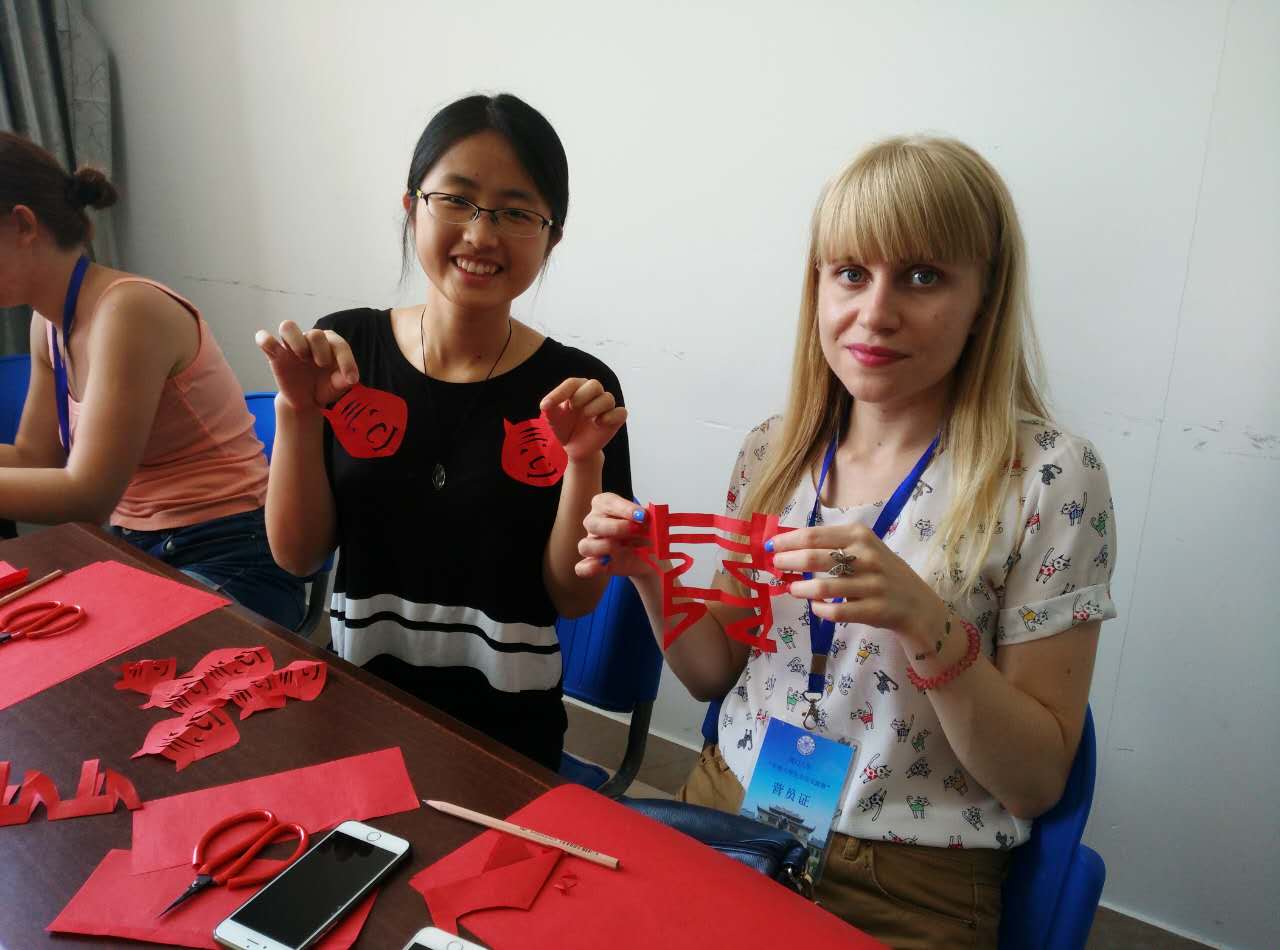 7月16日,在这个普通的周六,华体网俄语专业师生与来自俄罗斯的伙伴们进行了一场别开生面的“课堂教学”。上午9点,大家在外文学院415教室,先欣赏了一小段关于中国剪纸文化简介的视频,随后,在两名学生的中俄互动讲解中,开始了中国剪纸的学习。
