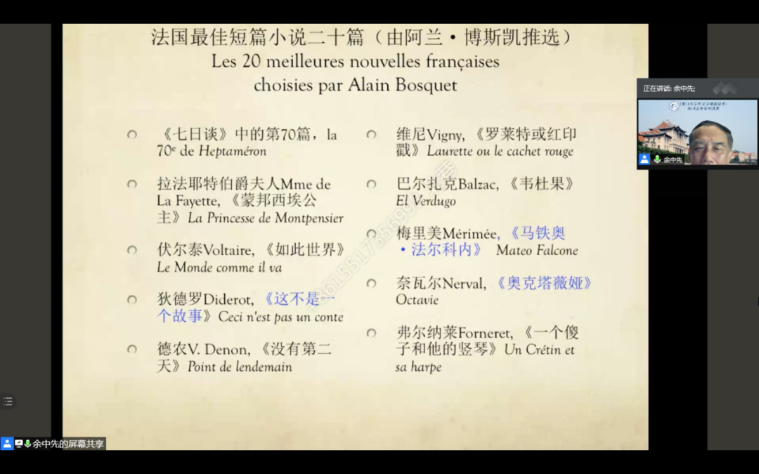 2020年11月3日晚19:00,厦门大学外文学院讲座教授、中国社会科学院外国文学研究所研究员、博士生导师、《世界文学》杂志前主编、傅雷翻译奖评委余中先教授为我们带来了法国文学系列讲座的第三讲《法国的短篇小说》,讲座由厦门大学外文学院法语系沈澍老师主持,在腾讯会议举行。