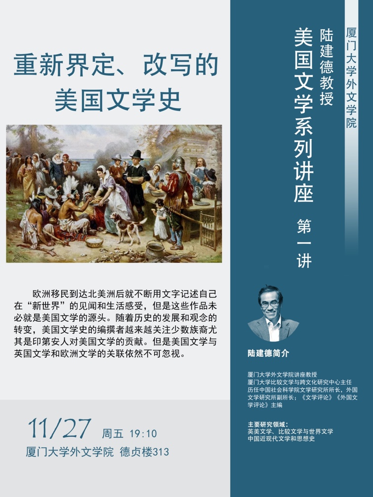 本次陆建德教授的美国文学系列讲座,承接他于2019年10月至12月在厦门大学外文学院举办的英国文学系列讲座,以“重新界定、改写的美国历史”开始,探索美国文学的渊源,接下来的三讲将以具体的十九世纪美国文学文本(《红字》、《瓦尔登湖》、《回顾:公元2000年—1887年》等)细讲文学、历史与社会的关系,欢迎大家积极参与和持续关注。