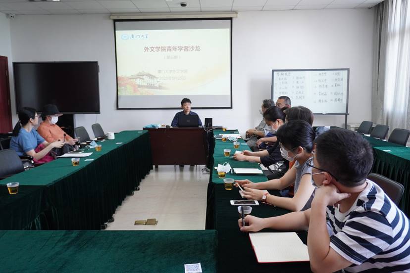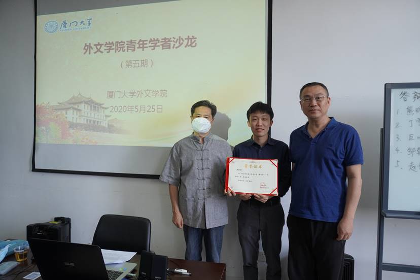 5月25日下午,厦门大学外文学院第五期青年学者沙龙活动于德贞楼319会议室顺利举行。学院青年教师黄若泽应邀担任本次活动主讲人,胡兆云担教授任点评嘉宾。杨士焯教授主持活动并为黄若泽老师颁发证书。