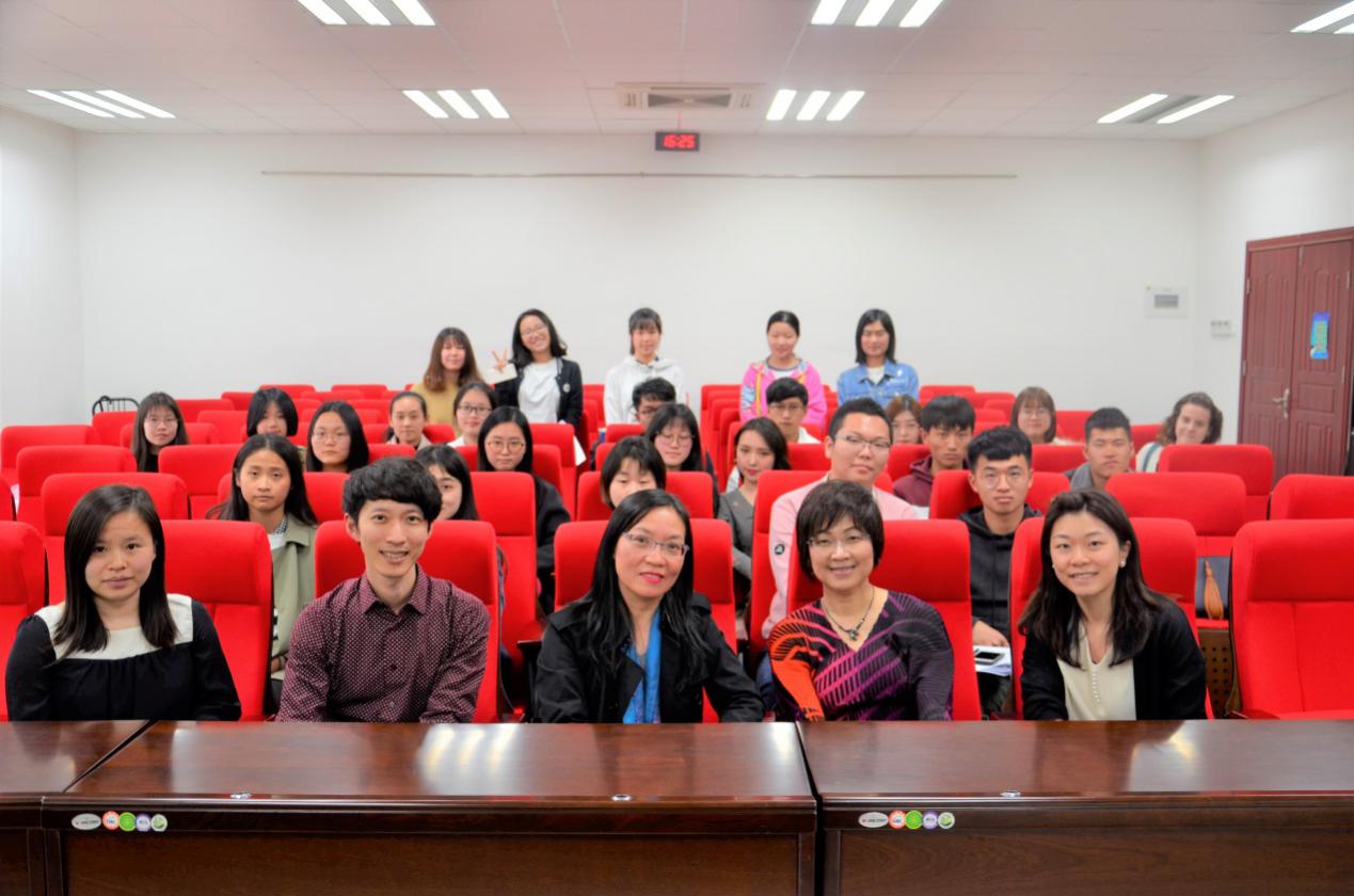 第三场讲座由外文学院副院长李美华教授主持。李美华教授首先总结了自己关于翻译主题的理解:译者无声。她表示,无数优秀的翻译其实都是来源于译者的默默钻研。此番话引起了现场同学们的深思,现场学术氛围因而更加浓厚。本场讲座主题是“美女不忠”:中诗西译的诗韵格律与文化内涵》。张淑英教授以流行音乐《Despacito》为引,循序渐进到古诗、现代诗,由浅入深地为大家讲述了中诗西译的历史、经验和经典,提出“美女不忠,信言不美”是中诗西译的重要规律。她还向大家介绍了中文诗句在翻译成西文时如何保持原有的美感、如何在韵脚格律上多多揣摩、如何在文化内涵上精雕细琢以提高译本的理解度等知识。此外,张淑英教授还对比了台湾与大陆中西翻译的不同风格。讲座结束后,张淑英教授与到场师生合影留念。