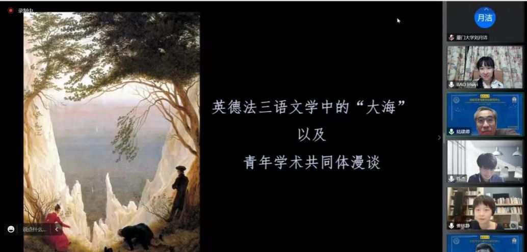 9月23日晚,厦门大学比较文学与跨文化研究中心学术讲座暨多语种读书会第一期“沙仑的玫瑰:英德法三语文学中的‘海洋’”在云端拉开序幕。三位主讲嘉宾分别是来自复旦大学外文学院英文系的包慧怡副教授、法文系的陈杰副教授和德文系的姜林静副教授。“沙仑的玫瑰”是由三位主讲嘉宾发起的诗歌工作坊,长期以来致力于多语种诗歌的翻译、写作、评读与分享。讲座由中国社会科学院外国文学研究所刘雪岚副研究员和厦门大学外文学院教师王凡柯副教授主持。本次讲座内容跨越古今,穿越多语种文学圈层,展现了古往今来人们对于海洋丰富奇幻的想象力。