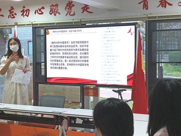 4月21日国务院新闻办公室发布《新时代的中国青年》白皮书,这是我国首次专门就青年群体发布白皮书。在本次主题党日活动中,2021级翻译硕士党支部正式启动《新时代的中国青年》白皮书金句翻译活动,作为党支部工作“立项活动”的一部分,旨在通过组织党员参与时政热点要闻的翻译,以“党建+专业学习”模式推动党员提升思想政治素质,练就干事创业过硬本领,争当事业闯将。最后,由党支部书记孔雯领誓,与会党员重温入党誓词,全体党员面向党旗庄严肃立,重忆入党初心,汲取奋进力量,铿锵有力的声音在党团活动室久久回荡。