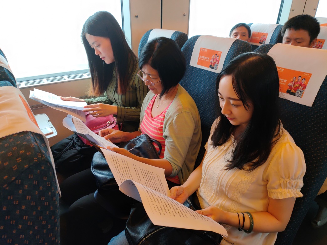 法语系教工党支部党员在动车上认真学习内迁长汀的历史