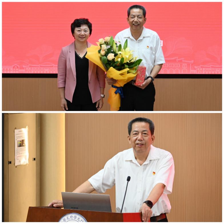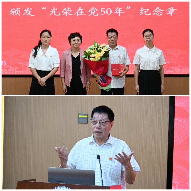 会议精心安排“致敬老党员”环节。徐琪为英语系退休教师雷天放颁发“光荣在党50年”纪念章,学生党员代表献上鲜花,向老党员致以崇高的敬意。雷天放老师分享了他在党50年的感悟,回顾了自己参与开垦北大荒的青春故事以及教书育人几十载的奋斗历程,彰显出“一生忠于党,退休不褪色”的政治本色。他鼓励师生党员既要仰望星空,又要脚踏实地,既要有激情敢担当,又要立足岗位做贡献,为党和人民事业再立新功.